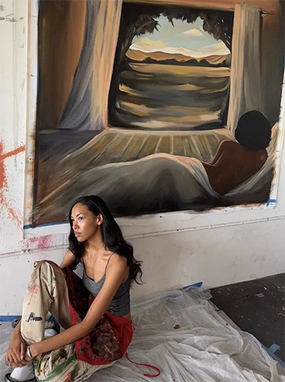 In the Mack Foundation website, Harris explains: “My work explores feminine power through communion with nature and self. Figures often wear their hair natural, symbolizing liberation and grounded confidence, inhabiting worlds shaped by serenity rather than survival.“1 Her practice draws from surrealism to imagine alternate realities—spaces of respite and possibility that serve as both meditation and response to our era’s mounting pressures: global unrest, climate change, and technological disruption.