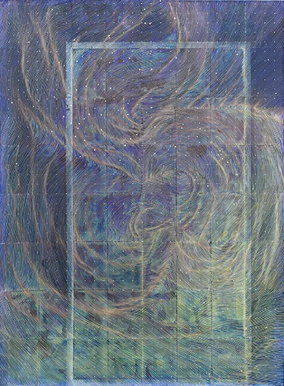 linn meyers, The Moon is a Thief, 2025, acrylic ink and acrylic gouache on linen. Courtesy of the Artist