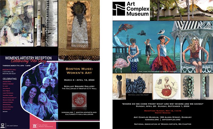 Artscope Magazine Ads left to right: ”Boston Muse: Womxn’s Art’ The Scollay Square Gallery, The Galleries at Boston City Hall, March 4 – April 12, 2024, featuring works by Yildiz Grodowski ‘Where Now?’, Carol Baum ‘Dear Carol Love Ola Mae’ and Susan Siefer ‘Museum Portrait (homage to my ancestry)’; Women’s Artistry Reception: Celebrating Herstory, March 7, 6-7:30 pm a special evening with Mayor of Boston Michelle Wu’s ‘City of Boston special event with po-ets, DJ, and more and ‘WHERE DO WE COME FROM? WHAT ARE WE? WHERE ARE WE GOING?’ Art Complex Museum April 28 – Sunday, September 1, featuring works by Linda Post ‘The Procession of Hope and Feathers,’ Linda Hoffman ‘One Heart,’ Louise Laplante ‘Graph Gal,’ Cindy Journey, ‘Coterie’ with Poetry Celebration, and Reception Sunday, May 12, 1-4 pm.
