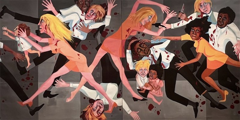 Ms. Ringgold’s painting, “American People Series #20: Die”, was completed in 1967 and is on display at MOMA. In her monograph on the piece, MOMA’s Anne Monahan had this to say, “Die’s formal discipline imparts a clarity that can be deceptive. The figures’ consistency – both their uniform clothing and depiction as racial types—makes it difficult to tell whether they represent one giant melee or sequential views of a few, repeating characters. At the same time, their matching bourgeois outfits imply that some class commonality has ruptured for unknown reasons.”