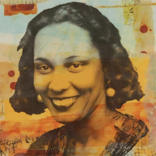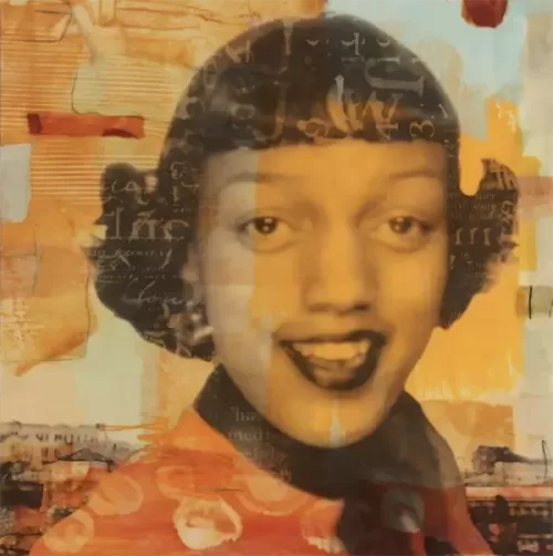 I have my photos, I print them, and I embed them in wax. I collage all the color down, and then I embed the portrait into the wax. And then I can draw back into it. I can paint over it. Sometimes I obliterate the background that I have created with paint, which is part of a new series I just completed.