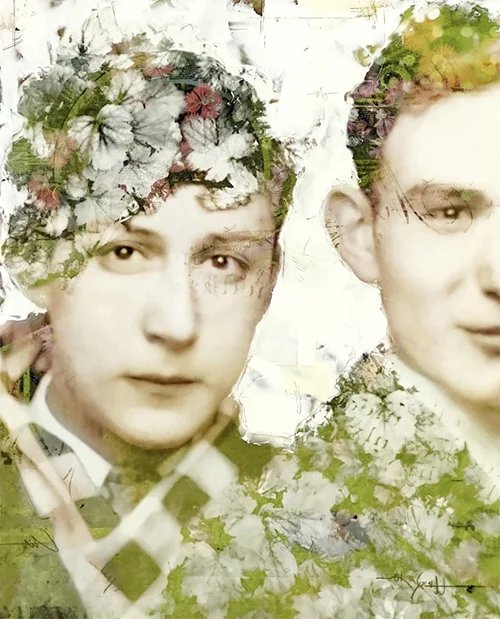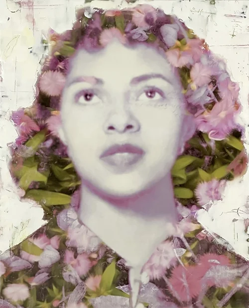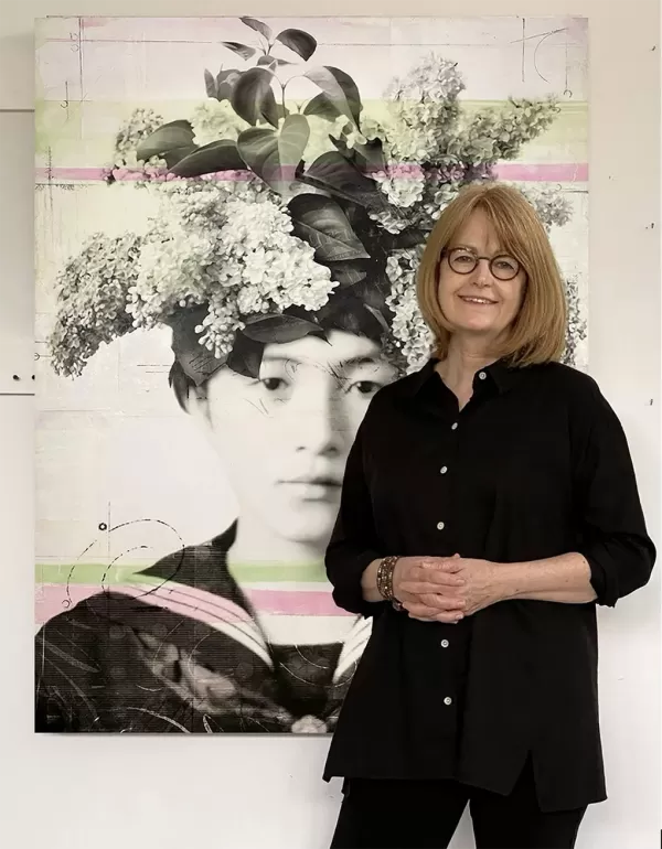 I had made a number of these portraits in black and white with color in the background, like I usually do. They were in my studio, and I thought, “This story is not done. These photos, these portraits, I think there’s more to it. What do I do?” I decided to try doing the full color photo. I have done that before —a full-color photo—but I just kept it on paper. I wanted to create an image on my computer and add color to the old 40s black and white photo, as well as color all the floral elements. They were, in effect, an extension of the original portraits. It was interesting to revisit and remind myself, “Stop making rules for yourself in your studio.” Just because I did these once doesn’t mean I can’t continue the story. It was an interesting experience. The original series was titled “Notable Inhabitants of Beacon Falls.” This series is called Nights Like That, Days Like These. Now in 2025, they’re very involved. So that’s what’s in the background. And I painted the background out and scraped it back.