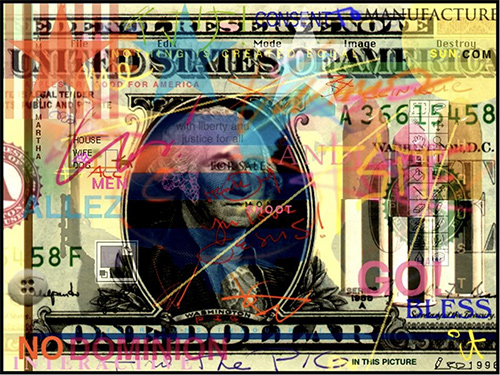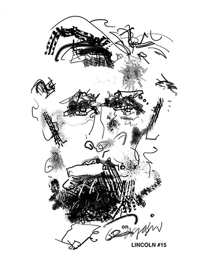 I printed it out in a little five-by-seven. And I just said, “God, look at that face, and all the stuff that was going on.” And I started pulling paper out and working digitally. I didn’t plan, like, “Oh, let me do a series of 19 Lincolns because Lincoln reminds me of …” That was your point. It was not conscious, not at all conscious. I responded to the world. And that seems to be my whole life in art.