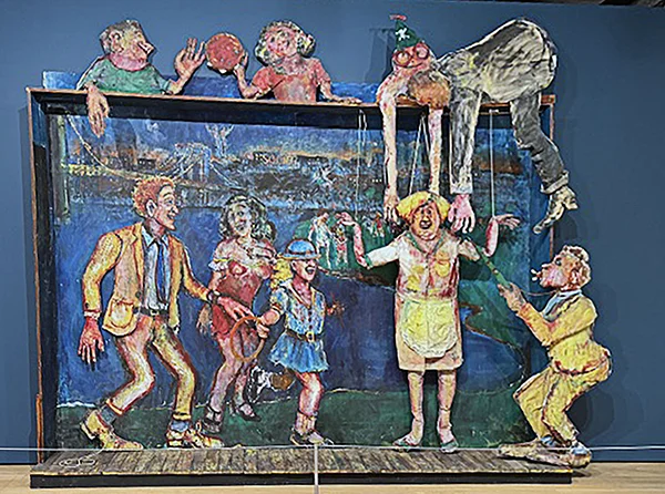 “Ascension of a Pig Lady” (1968) by Leaf is a mixed-media artwork that focuses on a waitress with white skin and yellow hair, combining acrylic on canvas with hand-sewn, stuffed figures made of wood and tin. The piece invites audiences to interpret its surreal imagery, encouraging reflection on themes of transformation, identity, and the imaginative possibilities found in art.