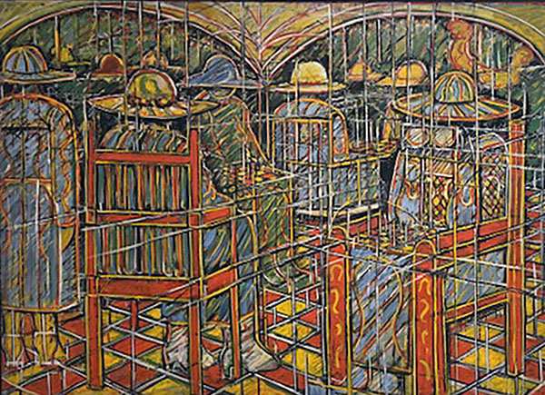 “Arcade Women” (1956), an oil painting by Leaf, uses dynamic figures and bold colors to explore themes of femininity and empowerment. The artwork’s composition highlights women’s resilience and connection, prompting reflection on female empowerment throughout history and today.