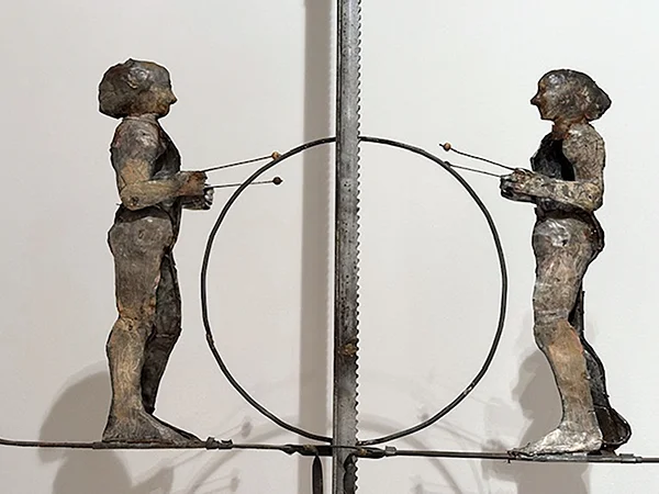 In “Two Woman on a Jack,” (2001), Leaf uses industrial materials like metal, tin, wire, wood, jack parts, and a crowbar to highlight her inventive approach. This not only showcases resourcefulness but also symbolizes the resilience and connection of women. The sculpture’s everyday objects reflect the complexity of relationships—a theme central to Leaf’s work—and transform ordinary items into symbols of strength and unity.
