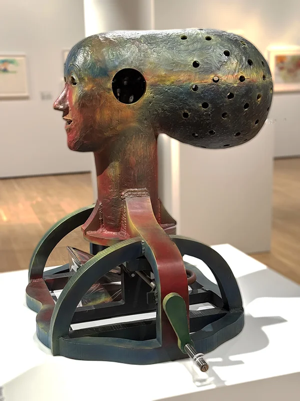 Upon encountering Leaf’s “The Head,” (1980) created from painted aluminum and stainless steel with movable parts, viewers are drawn to its bold presence. While the sculpture might inspire admiration for its originality and technical execution, it may also challenge the viewer due to its unconventional features.
