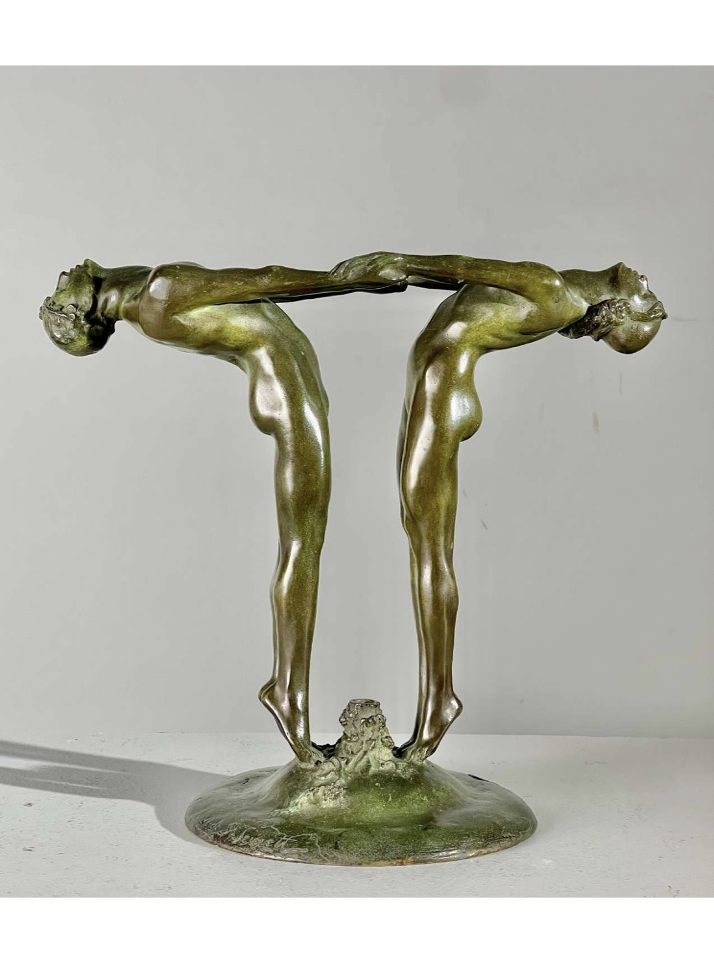 Jewett also created slender dancing figures, such as the 1924 bronze flower holder, consisting of two figures on tiptoe holding hands and leaning back as they appear to whirl. The work shows the influence of the sculptor’s teacher, Frishmuth, whose work is also known for lithe, slender dancers and the Art Deco characteristic slickness of surface, smoothness of idealized forms, and stylized poses.3