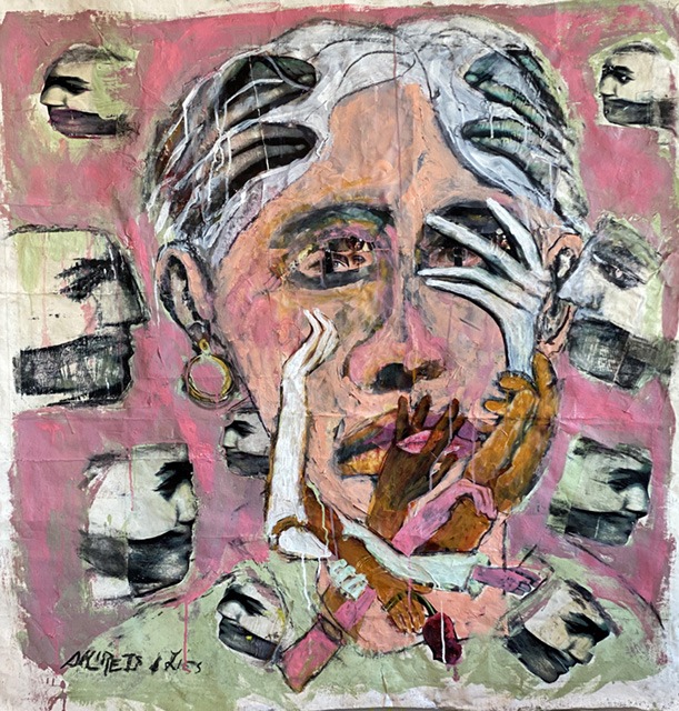 Exploring displacement through the lens of philosophy, history, and social justice and working them through the personal rather than the impersonal allowed my work to take new-found dimensions. Working from photos I take and research done in the form of conversation and note-taking is an integral part of my process. I use various media such as acrylic, pencil, ink, pastel, oil stick, charcoal, watercolor, oil pens, my drawings, collage, on