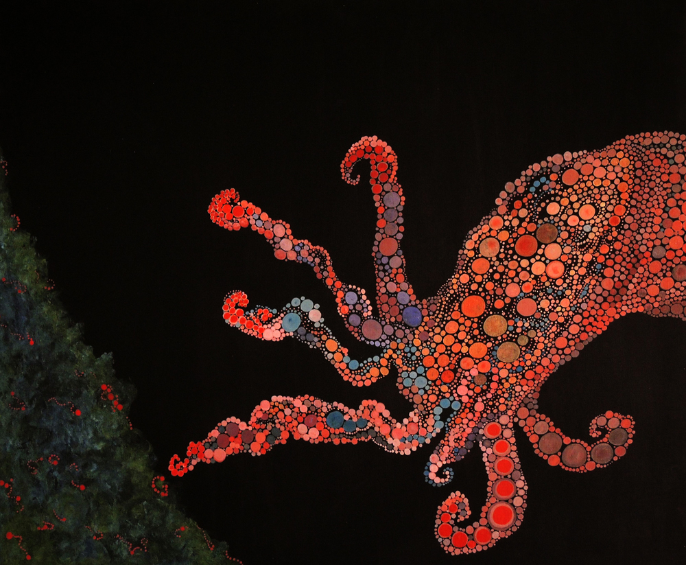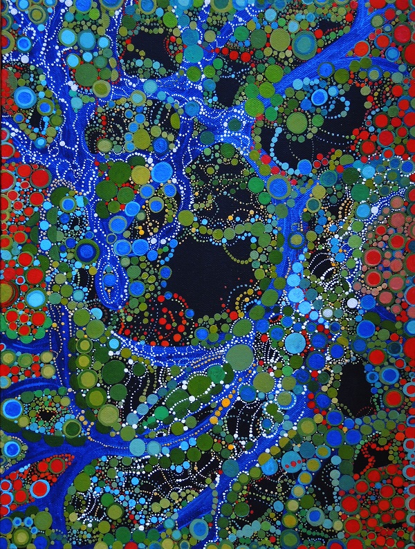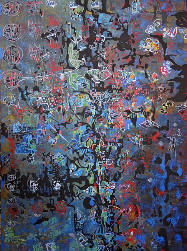 From Kadinsky, Miro, and Klee to the great architect and artist/environmental activist Hundertwasser, they all share a wonderful expression of nature’s rhythms. Hirsch’s work brings forth seductive patterns, flowing with pulsating energy throughout the artwork. Traveling twists and turns in themes of natural order.