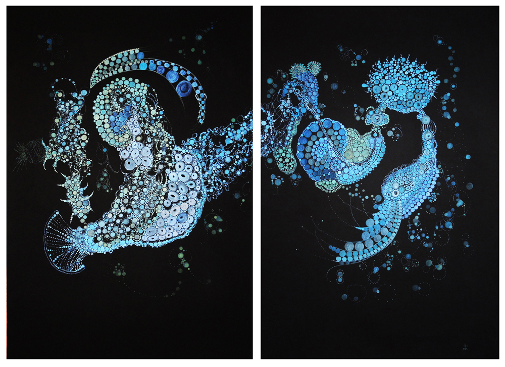 “Callie’s naturalistic sense is rich with visual information. One feels a sense of discovery when viewing her work. Her playfulness is evident in her organic dancing forms, which deal with highly decorated bodies, be they mammal or floral. The paintings are created in warm, inviting colors. We see bodies touching, plants reaching out, and portraits staring at us in curious ways. Callie’s work is an ongoing exploration, ever changing from the recognizable to the unknown. She introduces us to mysterious characters of her inner world. There is a sense of harmony and gracefulness in her work, similar to that of the aboriginal artists of Australia