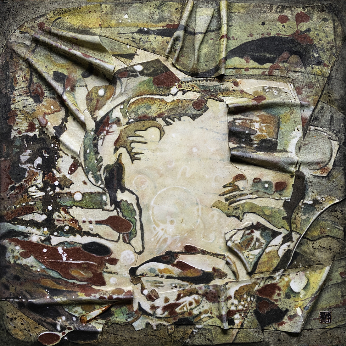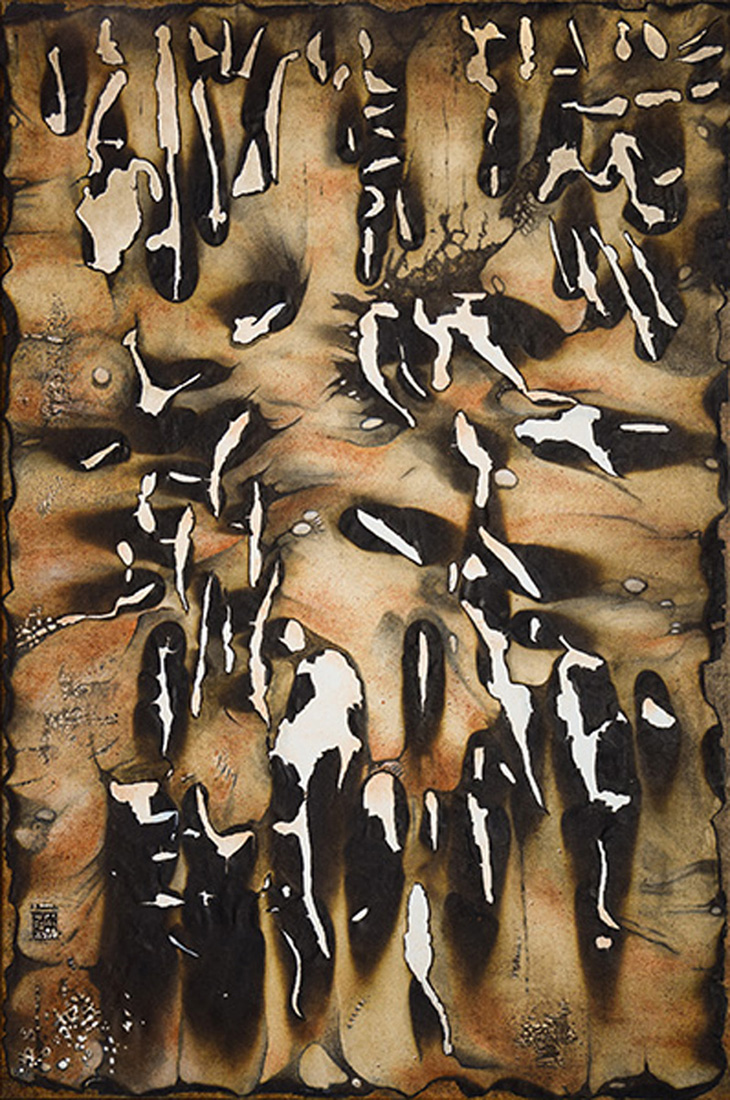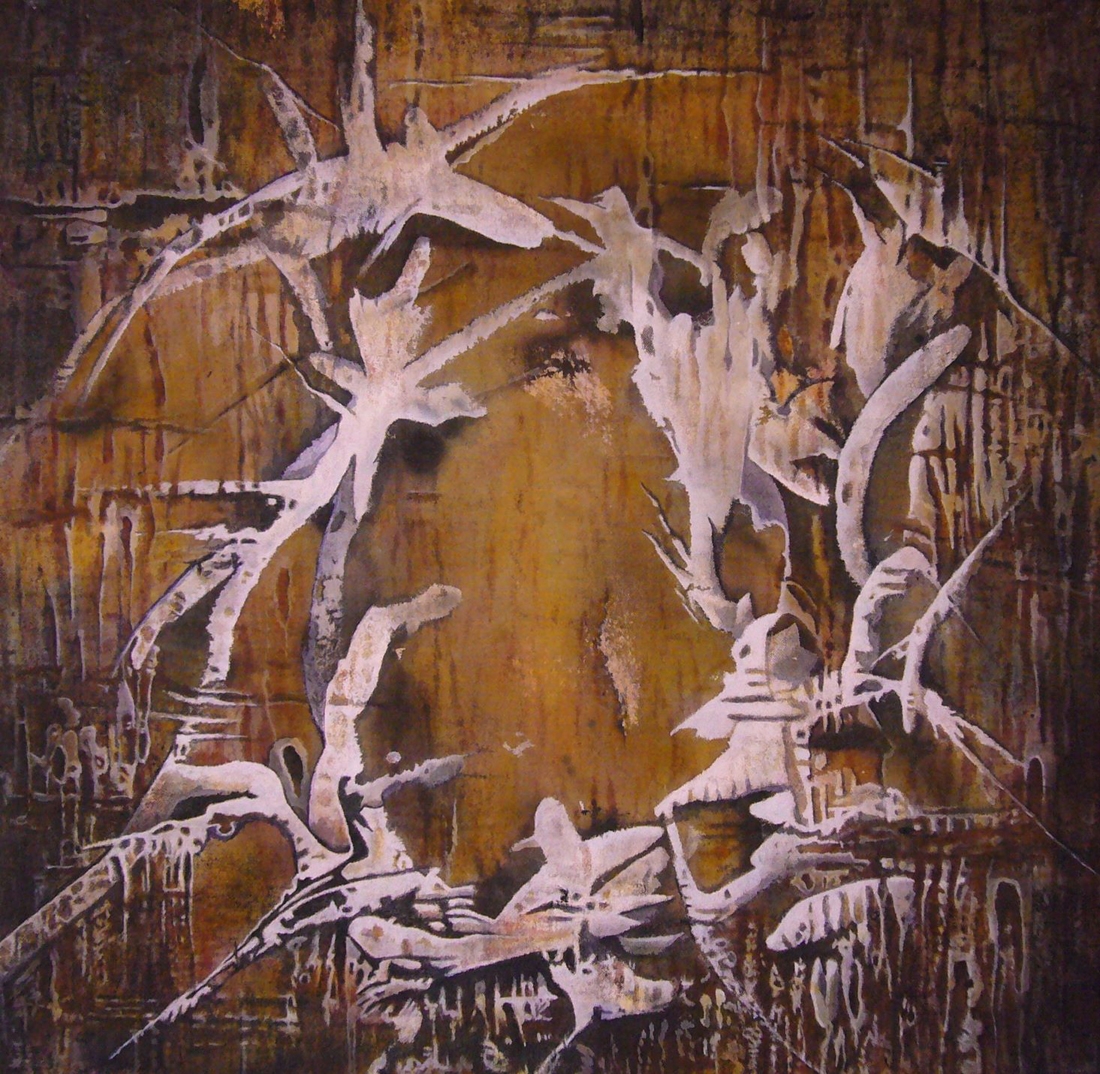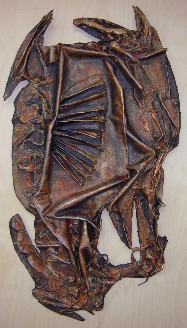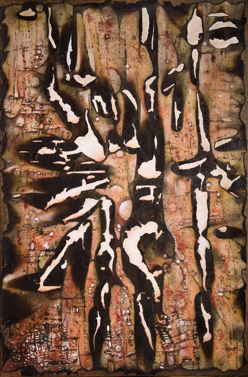 I am an abstract, expressionist painter working in acrylic, mixed media. My process begins by creating quickly rendered, spontaneous marks often painted while blindfolded. Once surfaces are created, I discover the elusive and symbolic meanings of my apparently random marks, shapes, and gestural renderings. Currently I am focusing on destroying the surface by burning, cutting, tearing, and crunching raw and painted canvas. I build texture and depth with collage elements, found objects, shell casings, feathers, and bark. My current wall sculptures, with no straight edges or boundaries, reflect my efforts to create art that is “outside and box.” I enjoy “making sense of nonsense,” finding meaning (hidden, elusive, symbolic) in haphazard beginnings. This stretches my mind, and pulls me into a discovery, problem-solving mode. I like the intellectual aspect of this part of the process. My work succeeds when I can integrate free experimentation and deep personal expression.