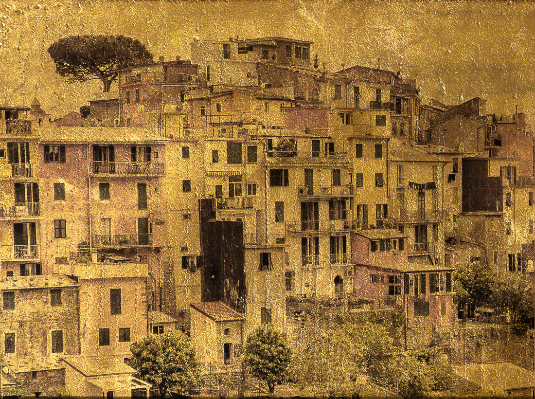 My gilded work takes the shape, light and form of my vision captured in my travels and creates an elegant metallic piece with a three-dimensional aspect reflecting light almost mystically.