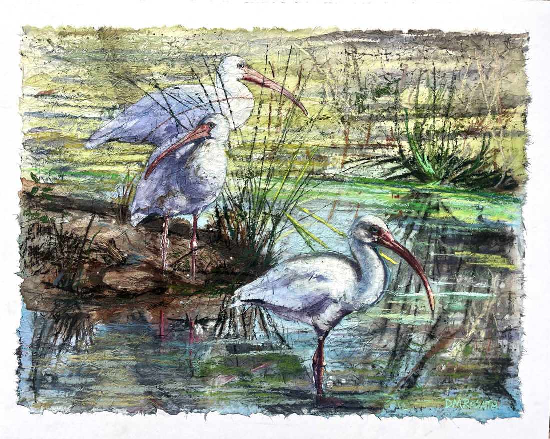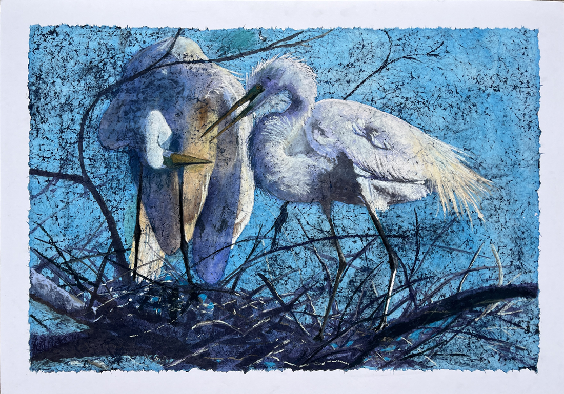 Light and shadow are extremely important to my work. Since I have 2 main mediums that I work with I utilize each one for different subject matter. I have a strong connection with birds so watercolor batik seems to bring them to life. It starts out as watercolor batik as I layer my watercolors between layers of wax. I then remove the wax when the surface is completely covered. I never quite know what to expect. I like to add some touches of pastel to bring out the highlights and the painting seems to come alive.