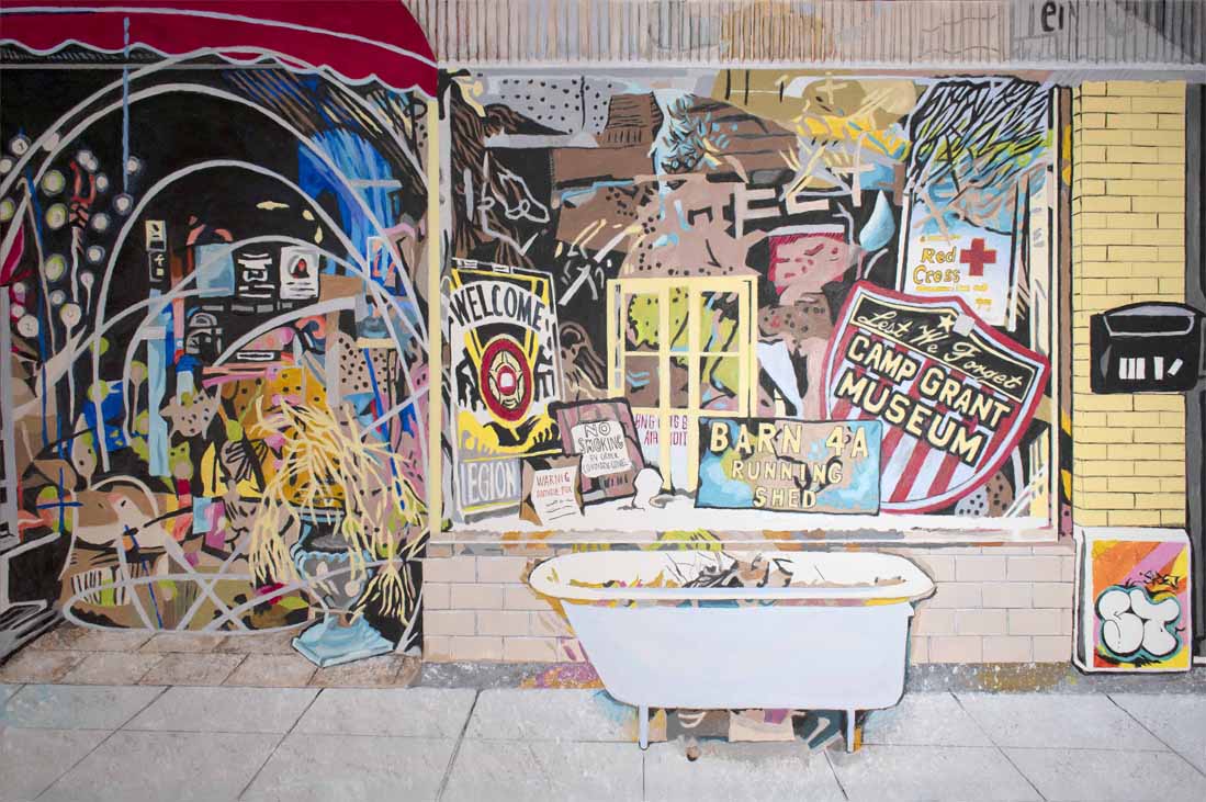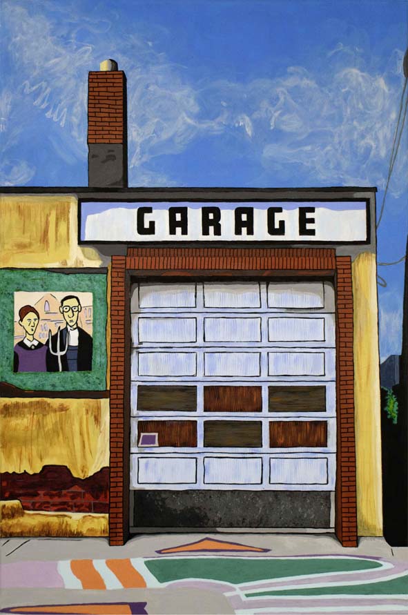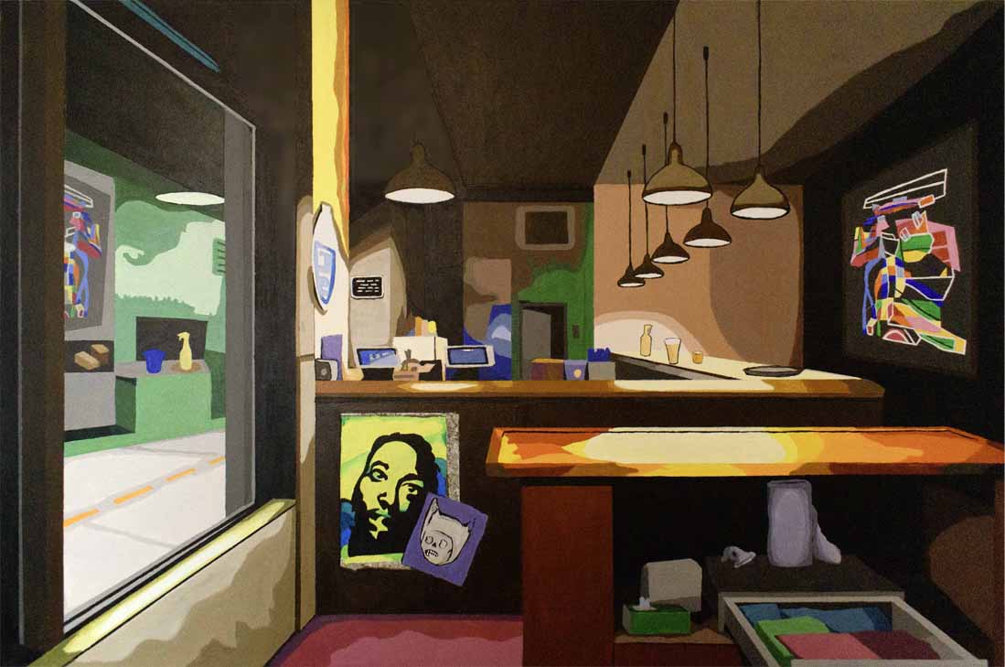 I recently created a small series of paintings and digital art that depict interiors, incorporating graffiti and street art. The overall connecting theme of my work is bold, bright colors and flattened forms. I prefer a nod to comic book-style art, an approach evident among the Chicago Imagists, a few of whom I studied with during college.