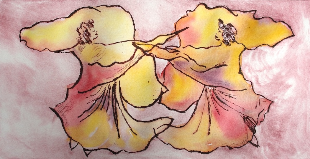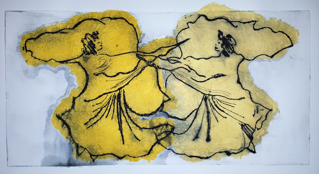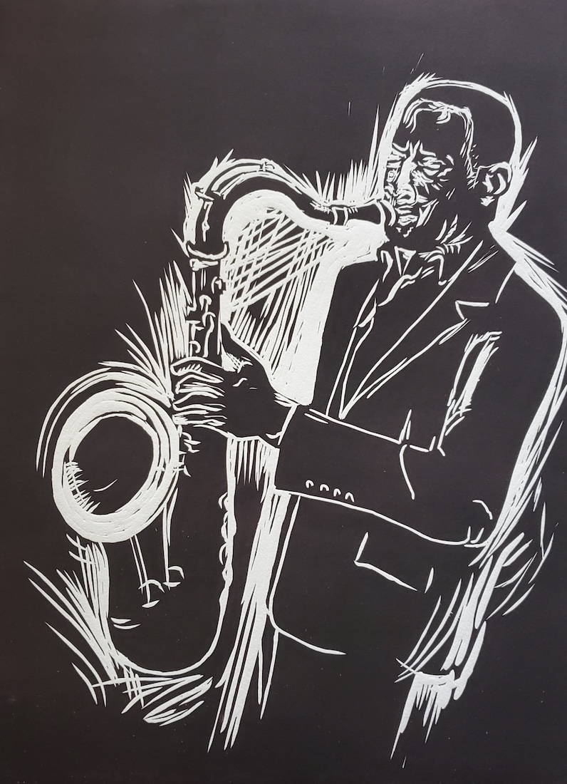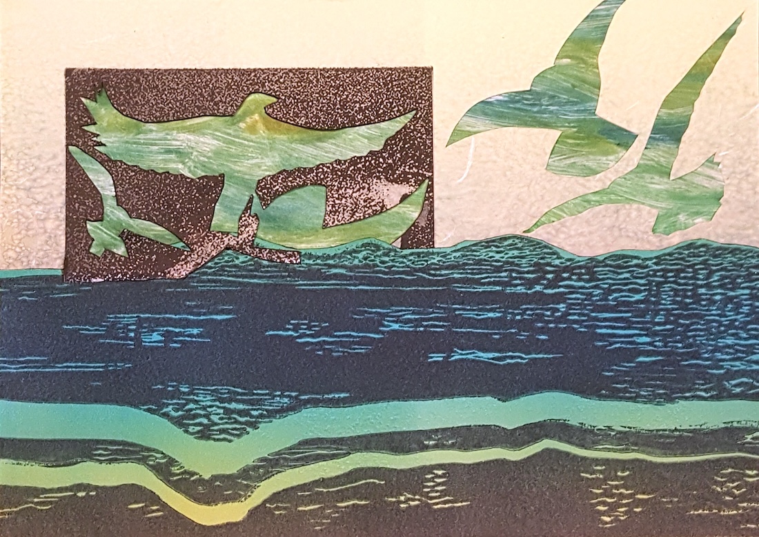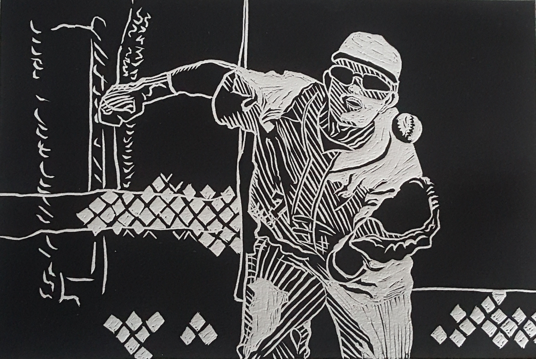Evolving from academic studies at a young age, employment as a graphic artist/designer, and instructor of watercolor and printmaking, I respond to imagery in my life and environment, including baseball, music, the Omen Series, and the Adulation Series, and more. I utilize linocut, woodcut, intaglio, photo transfer techniques, and layered combinations of all of them. Sometimes a simple black and white linocut print stands alone as a high contrast graphic image that says it all.