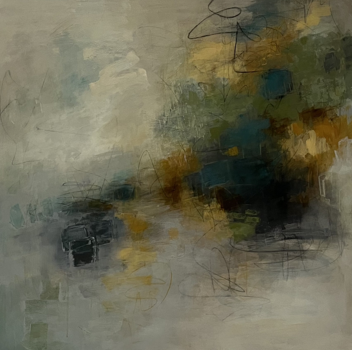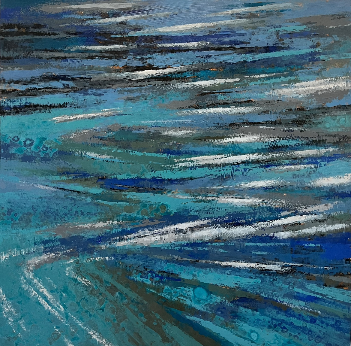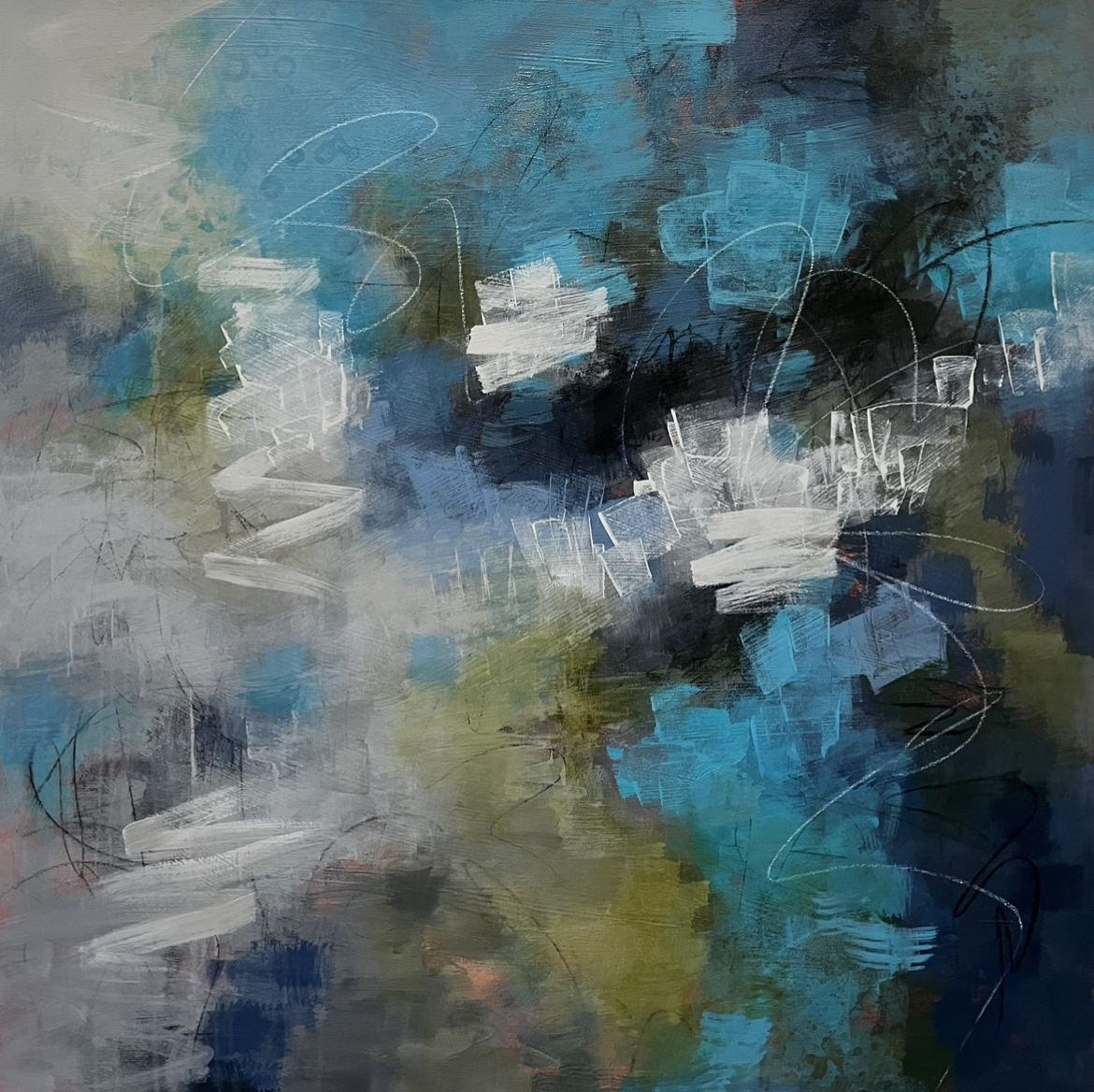 After years of painting representationally I ventured into the realm of abstract art and discovered a true sense of adventure in my painting. I love experiencing the mercurial aspects of abstract painting…never knowing exactly what the end result might be! Abstract painting demands a letting go, risk-taking, the courage to surrender to chaos, and the persistence to stay committed to each painting until it says ‘yes’.