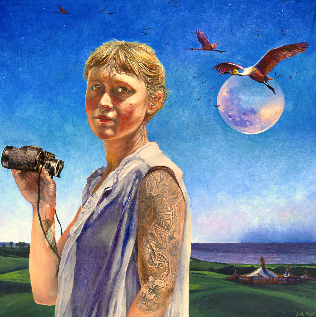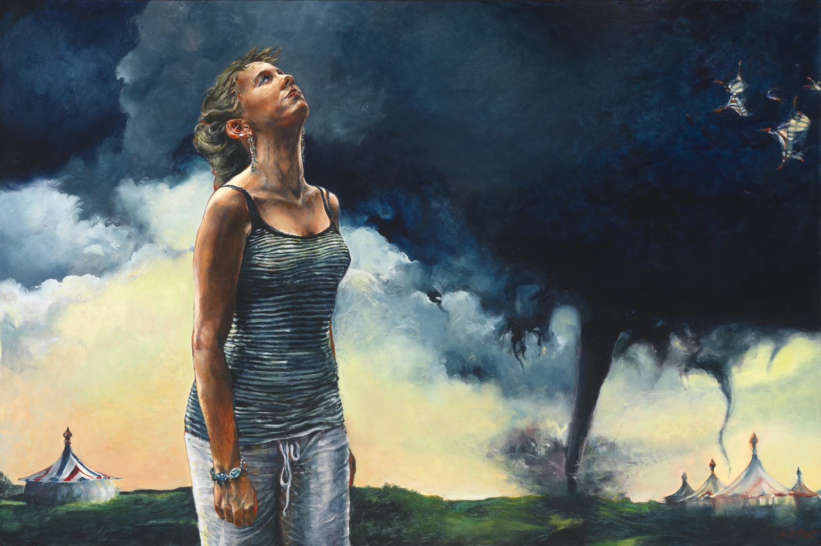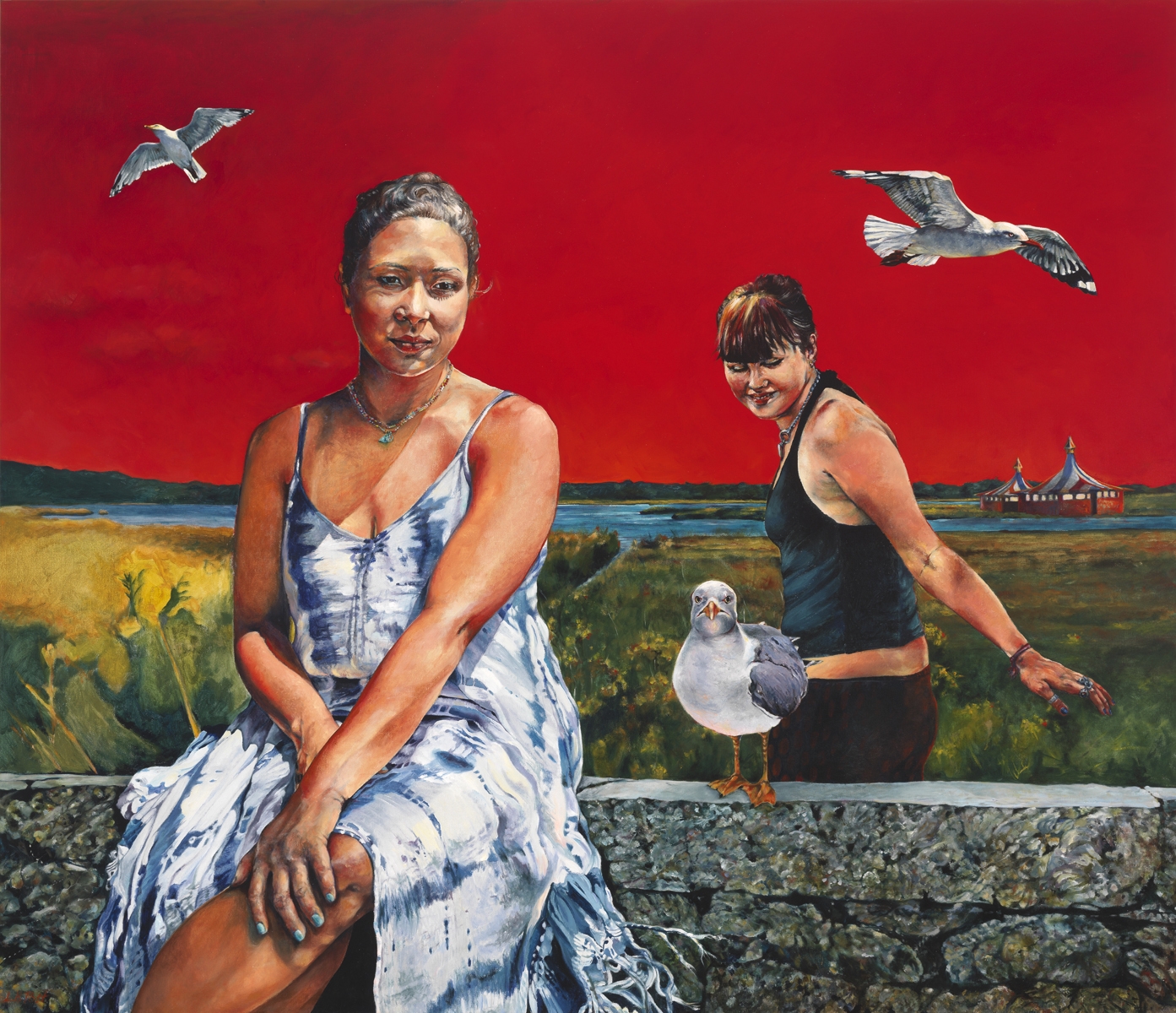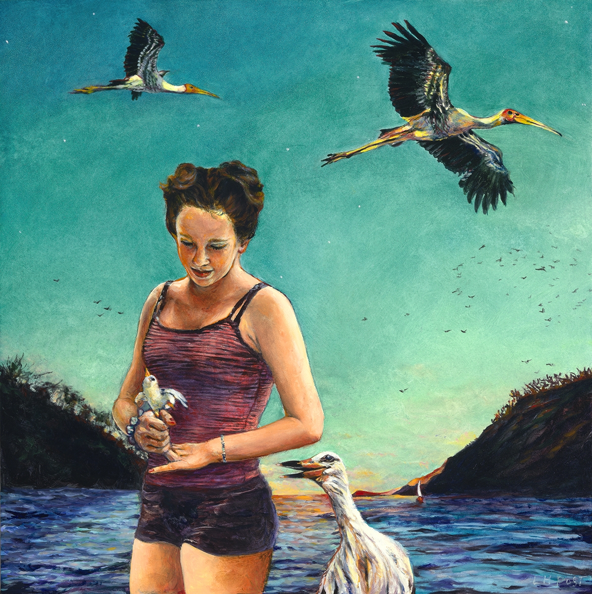 Shape-shifting striped tents appear and disappear. Birds, especially seabirds, have long been choreographed into my work, sometimes as companions, other times as avatars of change, growth, or escape. The conjunction of women, adolescent girls, and birds placed in enigmatic landscapes evokes an especially vivid dream.