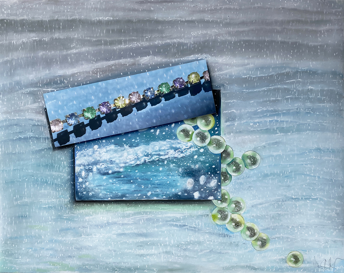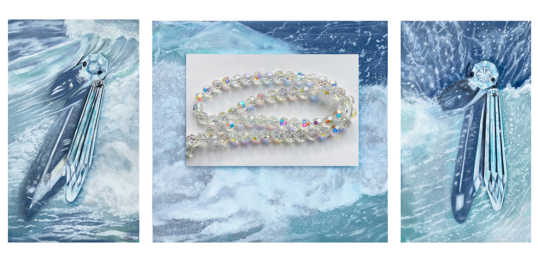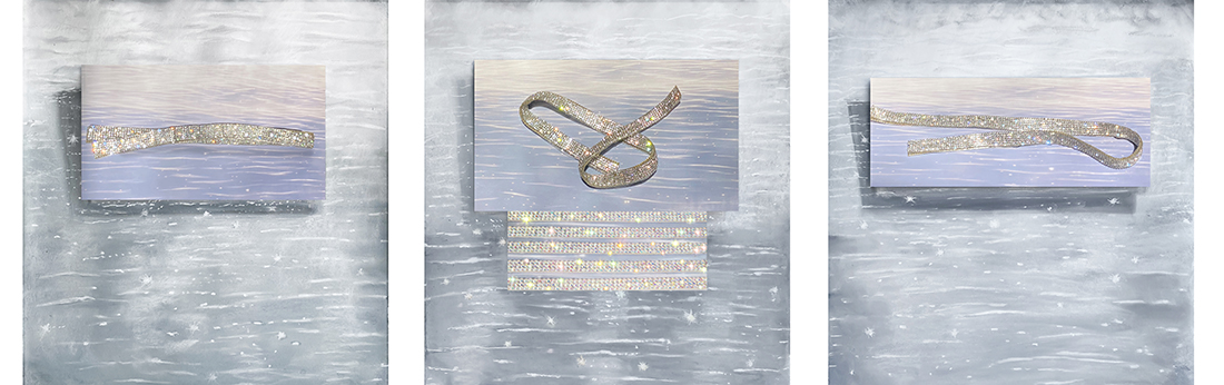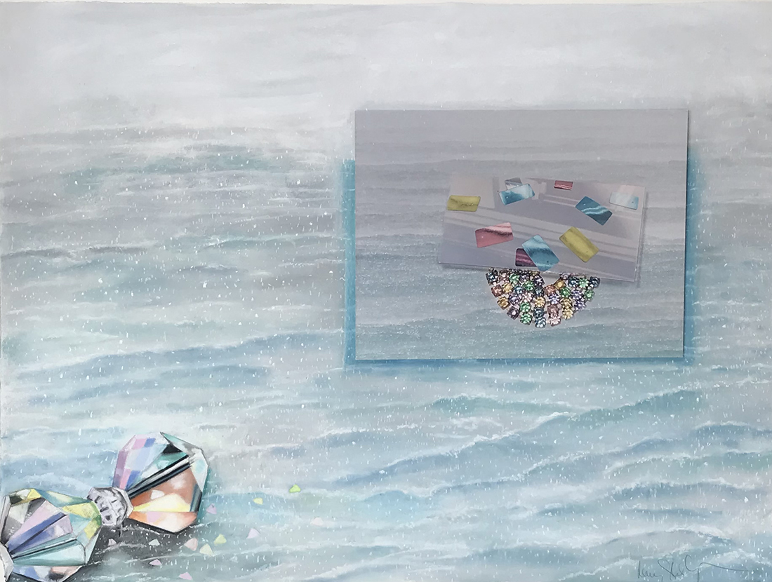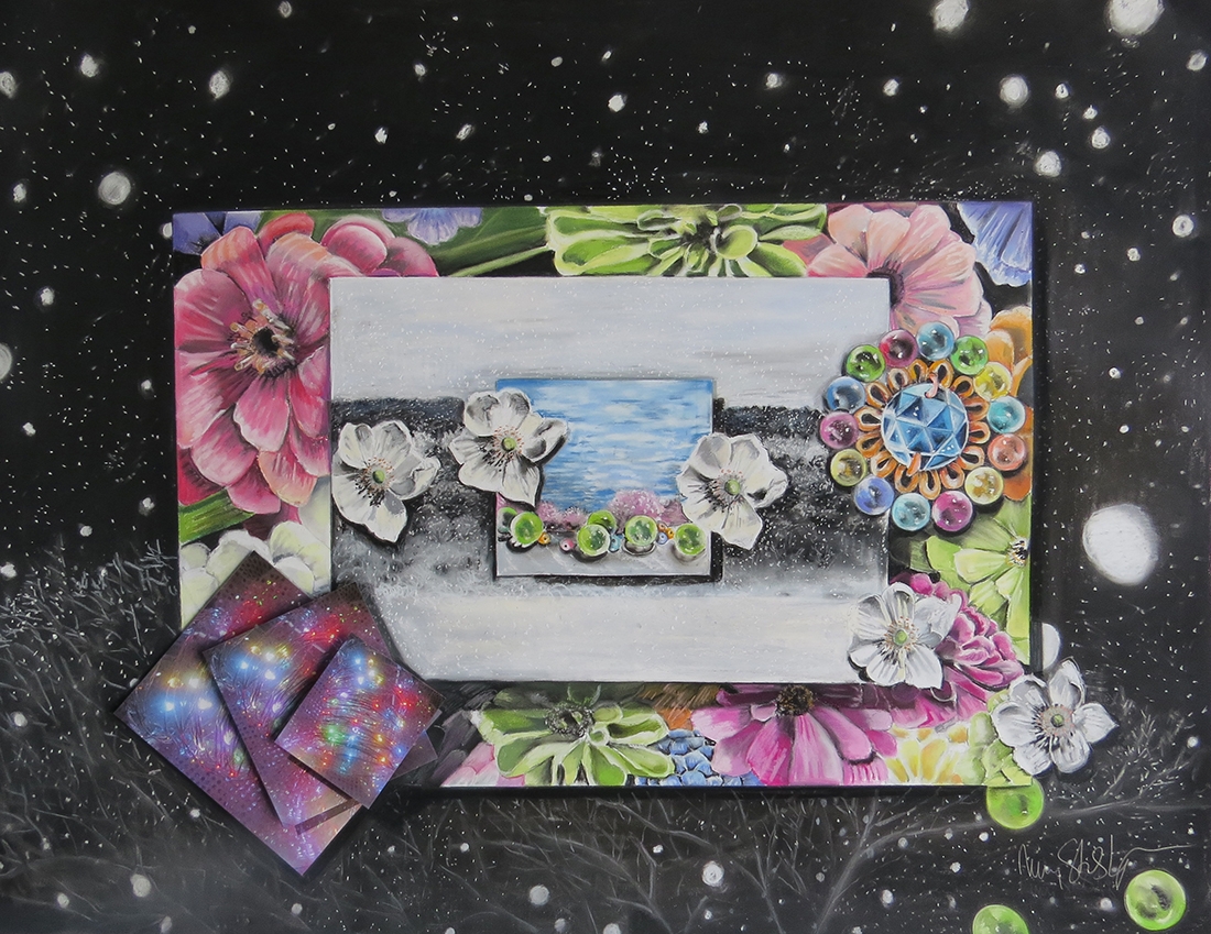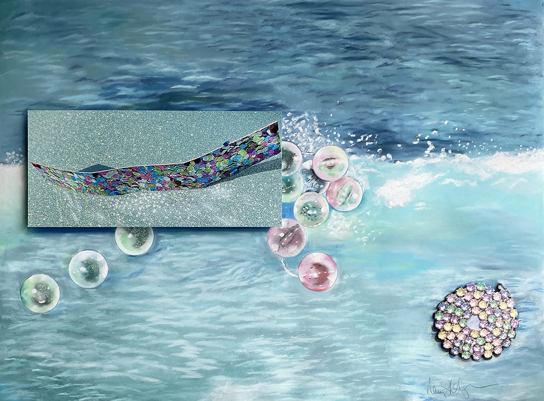 My assemblages are created by layering juxtaposing elements: nature vs. glitter. The viewer is immersed into my glowing, dazzling world of color, light, dimension and beauty. The effects are invigorating and enlightening and allows the viewer to pause and restore. These compelling compositions are the culmination of many carefully executed steps that define my unique creative process.
