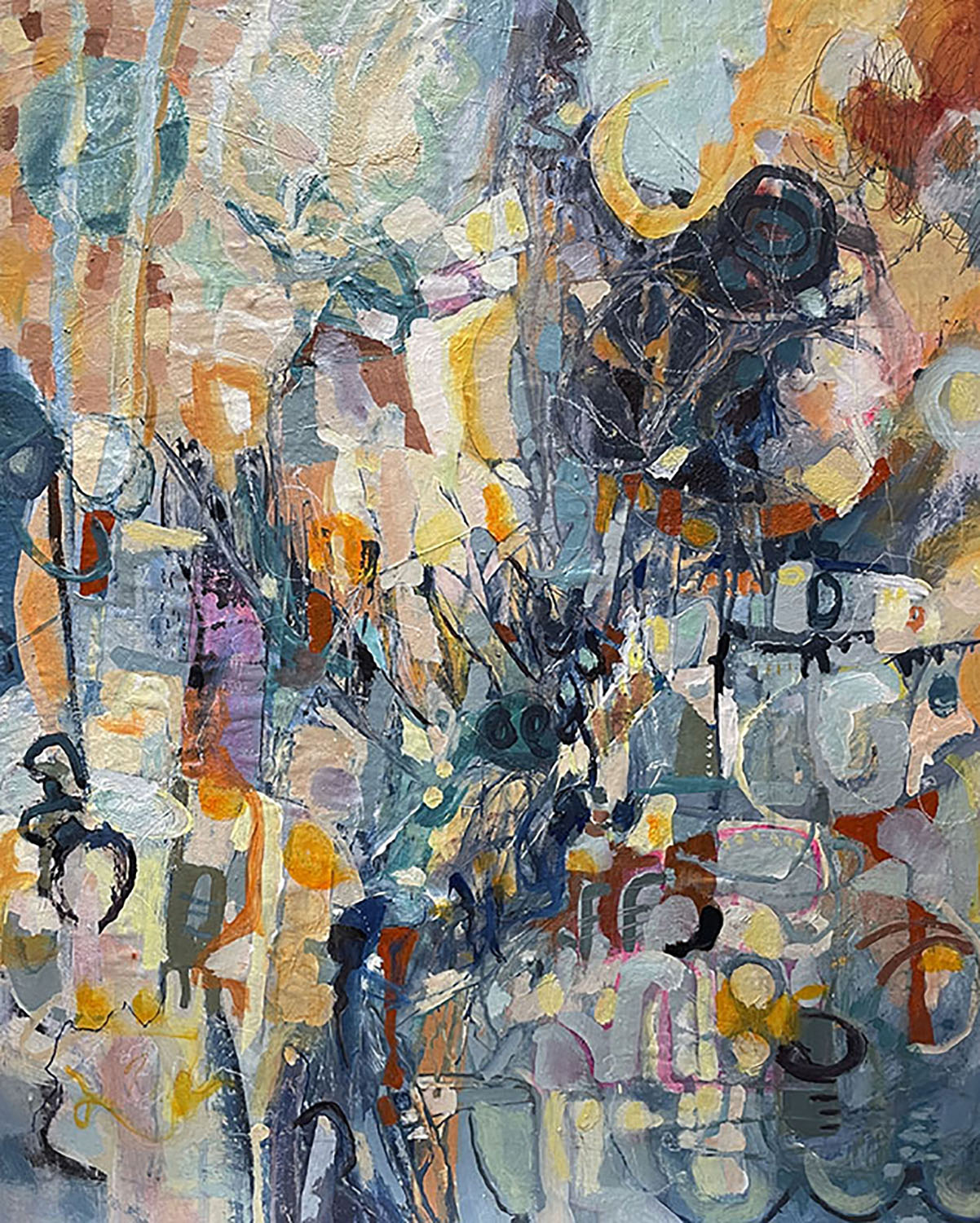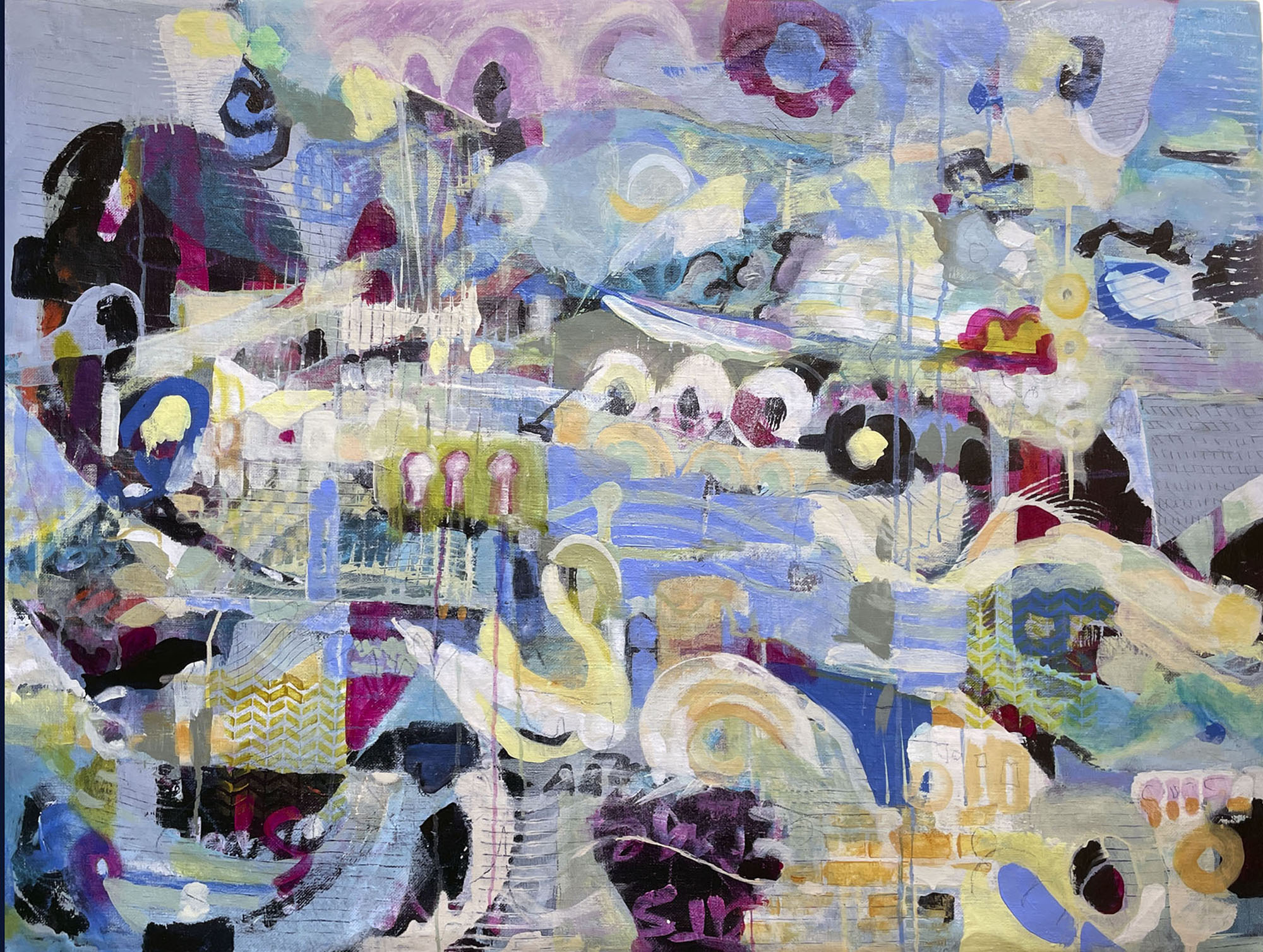 To create is like breathing. A part of you that you can harness to ground, elevate, soothe, heal. Like breathing, to not do it is not an option. You take it with you no matter where you go. To work, to play, to sleep, everywhere. Shape and form it to suit you. Share it or keep it close. I go to the sunrise.. Tides come in, then out, leaving behind a different trace. This is my act of painting. In the studio I begin the process. At the end of the day, the tide has receded and nothing is the same. Acrylic paint allows me to layer traces of what is becoming. Charcoal, graphite, crayon, stencils lend themselves to the story. A mark, color, movement, sound, feeling, smell, a response, Wild crazy marks, frenetic energy slashes followed by a slow mark tracing a path. I am the tortoise and the hare dancing together all at once. Painting brings me joy and like breathing sustains my life. I paint to bring me closer to who I am and who I am meant to be. I paint to heal. I want to share that.
