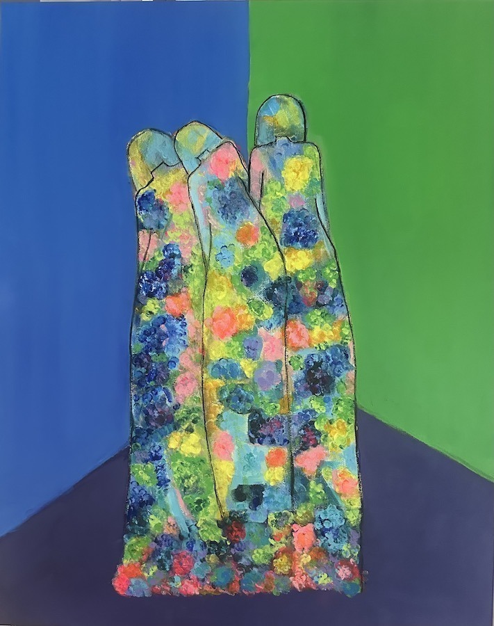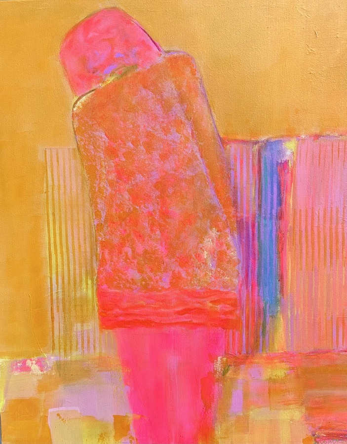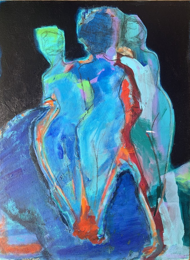 My artwork features a vibrant color palette, body language, and movement in abstract scenes of women. As I apply layers of charcoal and acrylic paint the figures are revealed and their stories emerge. My inspiration is rooted in my work as a somatic psychotherapist. It was a privilege to co-create spaces for healing with women as their narratives unfolded and we processed them together. These deeply personal moments and rich interior worlds, theirs and mine, are an ongoing theme in my paintings.