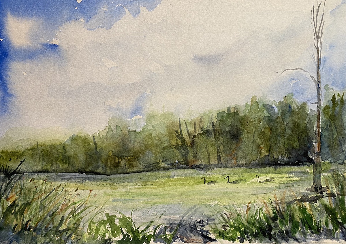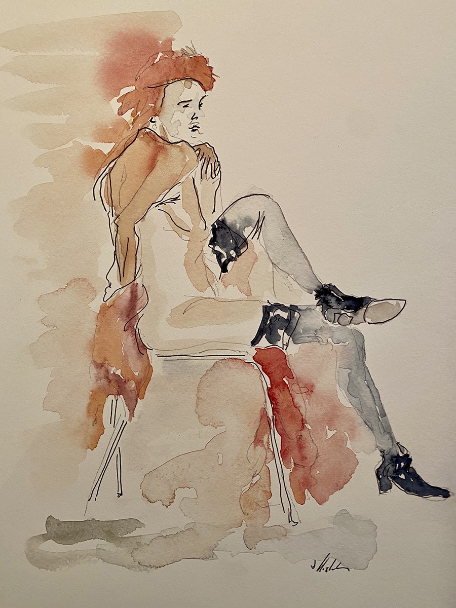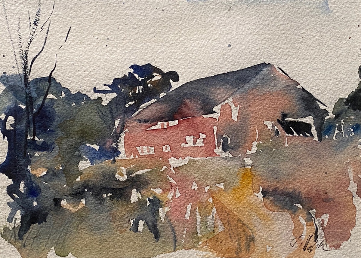 Watercolor paints and pen and ink are the tools to which I’ve always gravitated. I’ve been carrying around a little watercolor set since I was a child, and although as an adult I know that watercolors are hard, fast, and difficult to control, I nearly always find the colors pleasing, even if I think I’ve botched it. I’ve been honored to be an award-winning and much exhibited artist. My style is loose and fresh in figure studies and fast-sketch art, and aiming for sublime in mountain landscapes and vintage barns, the latter often plein air paintings.