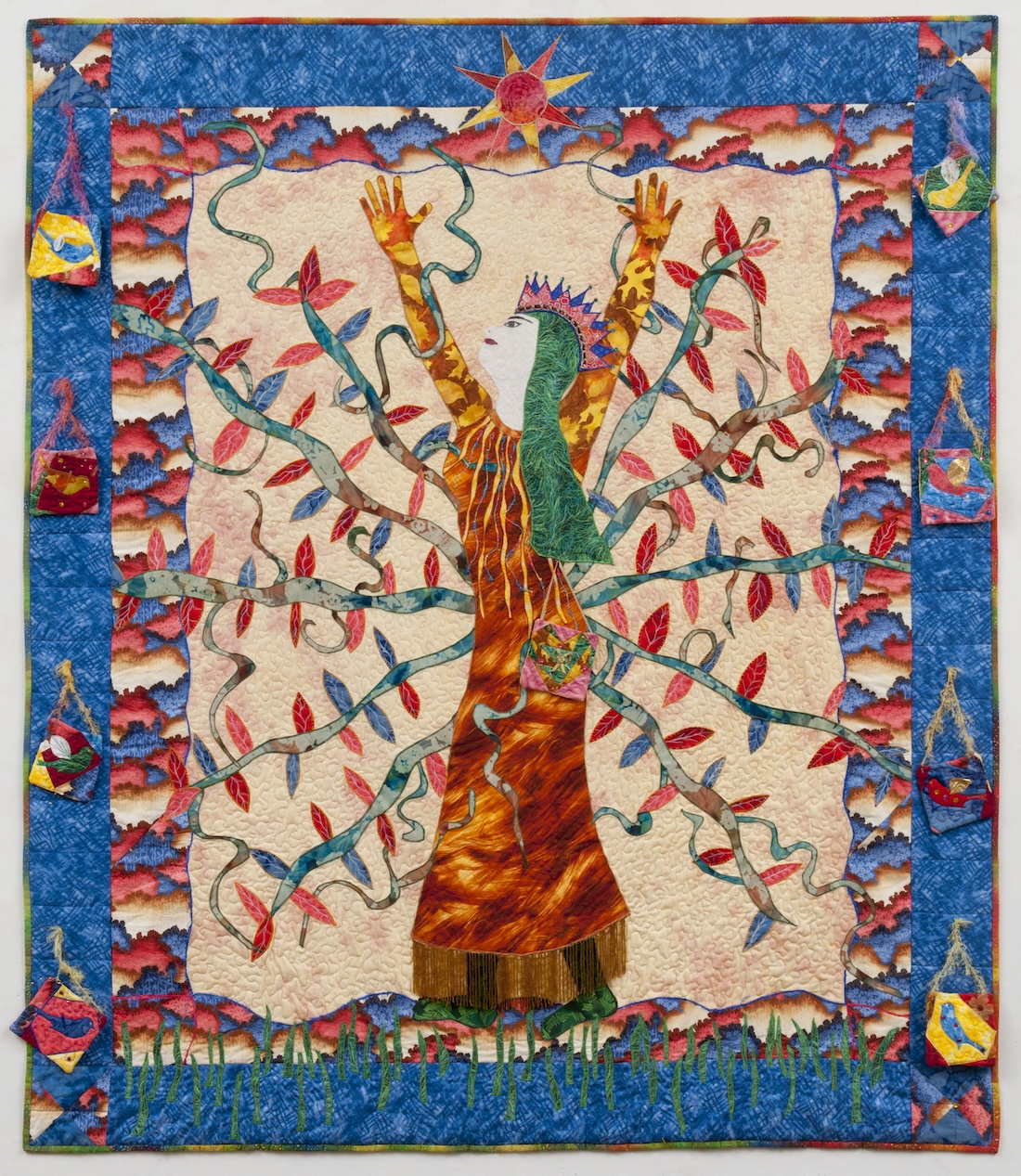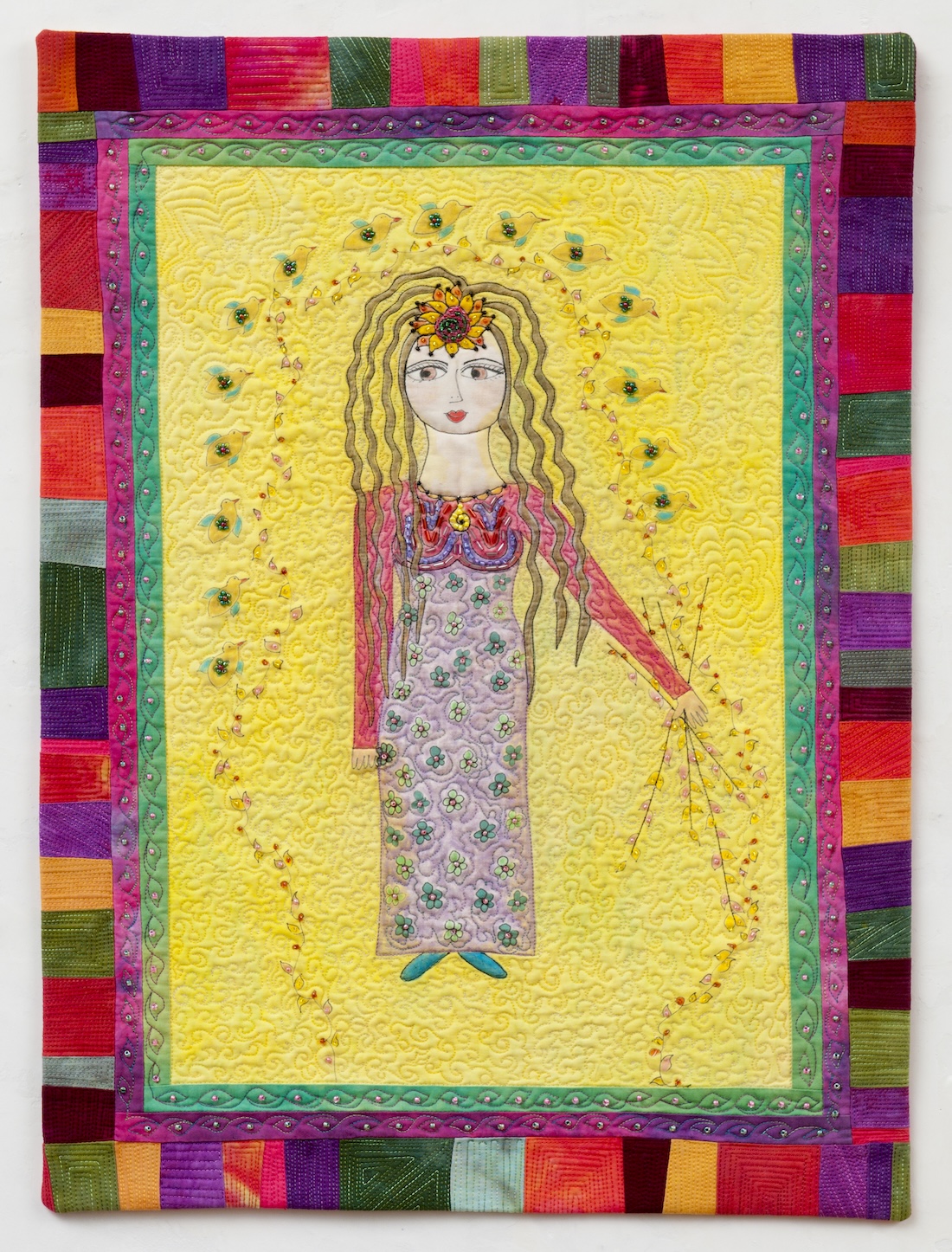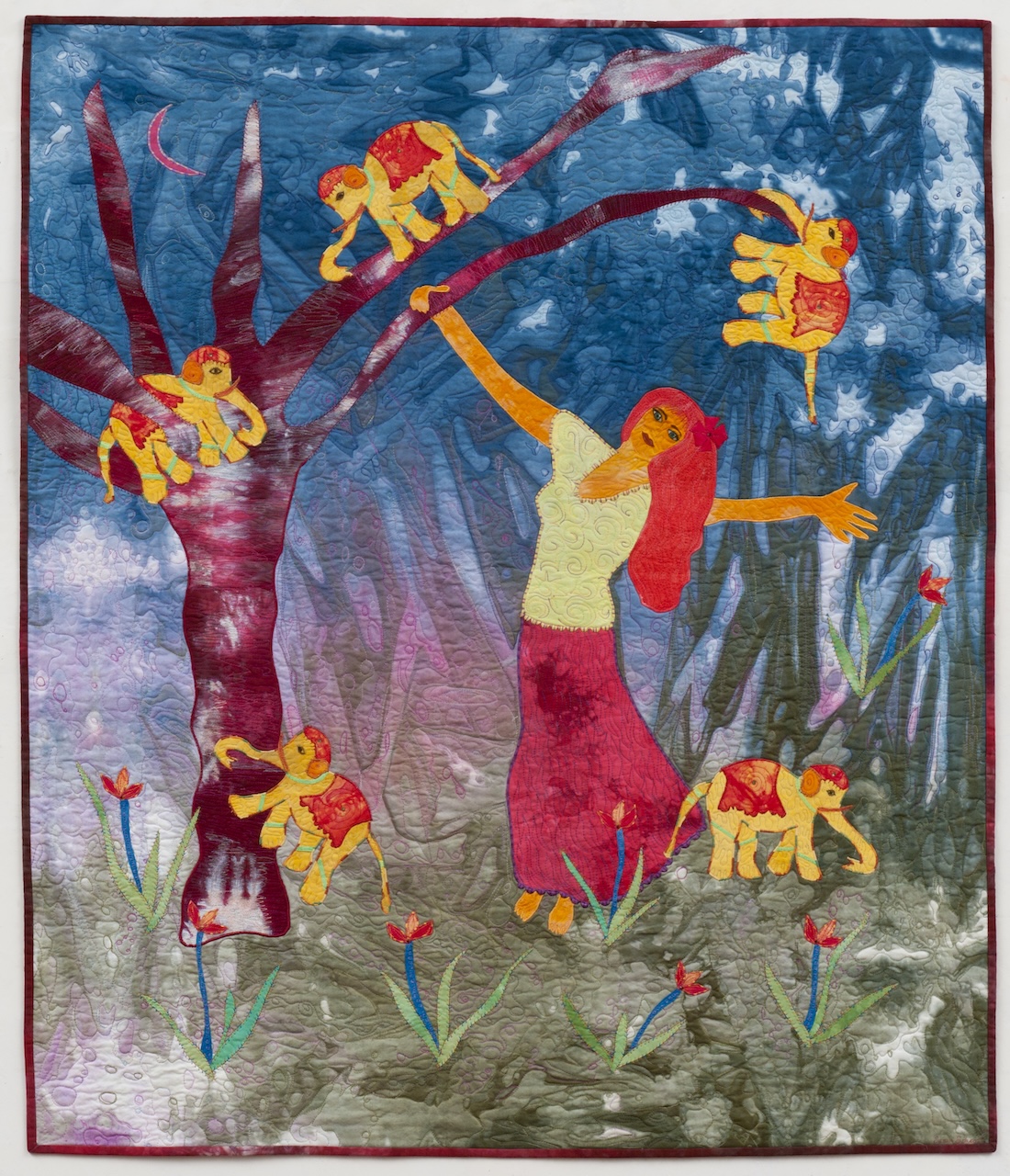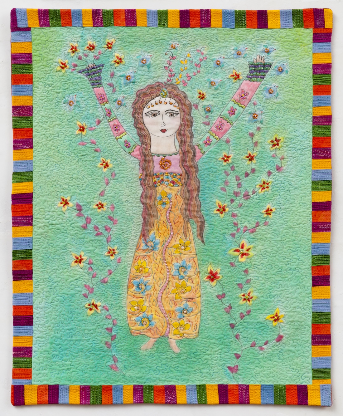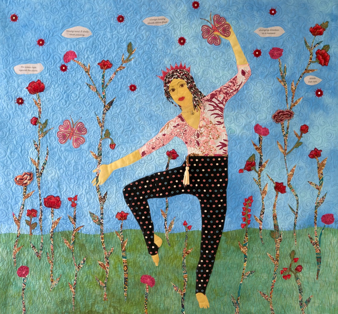 My art is a personal expression woven from the threads of my family, my work as a psychotherapist, my love of the sea and garden, and the rhythms of my spiritual life. Compelled by a deep passion for authentic self-expression, I create with hand-dyed and surface-designed textiles, threads, and mixed media — each piece a vibrant reflection of emotion and story. I honor and celebrate the spirit of women who are courageous, joyful, and transformative.