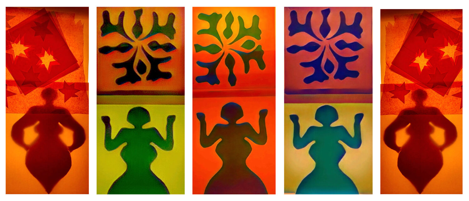 Five banners unfurl showing women with ideas, grounded women with fortitude.