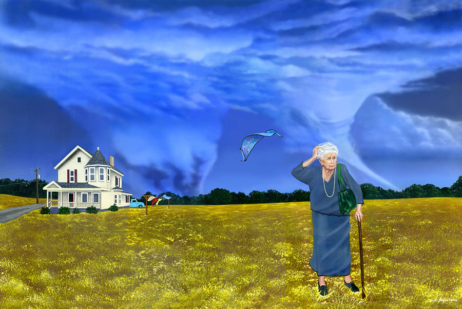 We see a woman leaving her home in a frightful storm with her purse and her scarf, she wanders pretty far away and the scarf lifts from her head into the wind. The expression of bewilderment and distress is not coming from the dark storm around her but rather from the loss of that piece of cloth. To me, this was also a moment that encapsulated all the craziness we felt around her whether good or bad or whether in youth or old age. Though I did not know it at the time the work was cathartic for me.