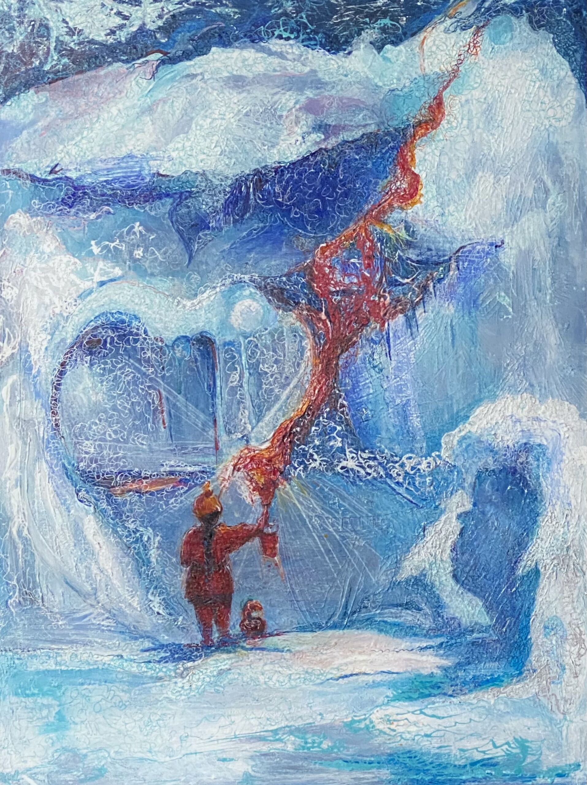 In this piece, one authentic heart meets a frozen world. “Making a way” speaks to the power of feminine presence. I created this work as an offering and a reminder that aligned creative action can dissolve even the deepest separation. It is about authenticity and integrity that open new dimensions and melt troubles away. It does not matter how tiny we feel; we will persevere as long as our hearts are strong. This girl is little, the world is vast and icy, and many beings are watching her quest.