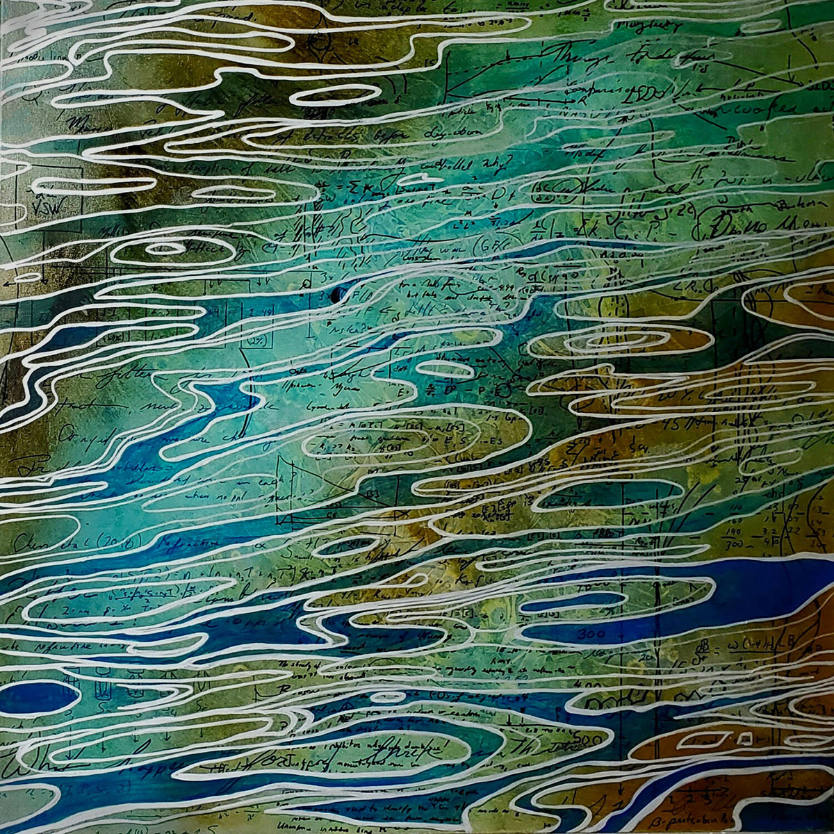 More than seven layers of transparent paint create the background upon which opaque black acrylic paint was used to inscribe research questions copied from an ocean scientist’s handwritten notebook. Several more transparent layers were added over the writing. Silver metallic paint was then used to define the fluid shapes suggesting ocean water.
