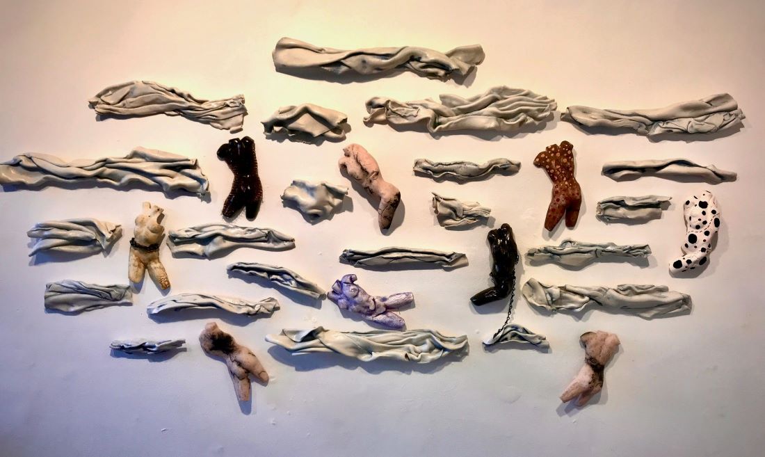 As a sculptor I am interested in the figure. As an Occupational Therapist I am interested in the repair of the body. This piece shows bodies in repair and the memories of past life. Everyone has memories that they would like to forget or alter in some way to make them more acceptable. I started with the folded porcelain forms, and then created the bodies. Some of the bodies broke in the clay or in the kiln. I decided to keep them instead of throwing them out and started repairing them as I had done in real life as an OT. Composing the elements in a group started to look like a message for life.
