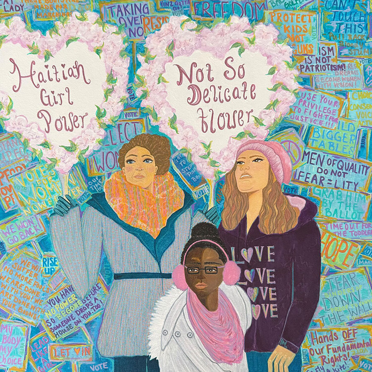 Our signs were shaped with intention, and filled with love to remind those who saw them that above all, we can live our lives without identifiers – except family. We represent what love look like, no matter where we were born, no matter what our language is. We don’t look like one another, and we find that to be beautiful. We laugh together. We argue together. We work together, lending more hands to lighten the load. This piece is a reminder to dare to hope. To look fear in the eye and conquer hatred.