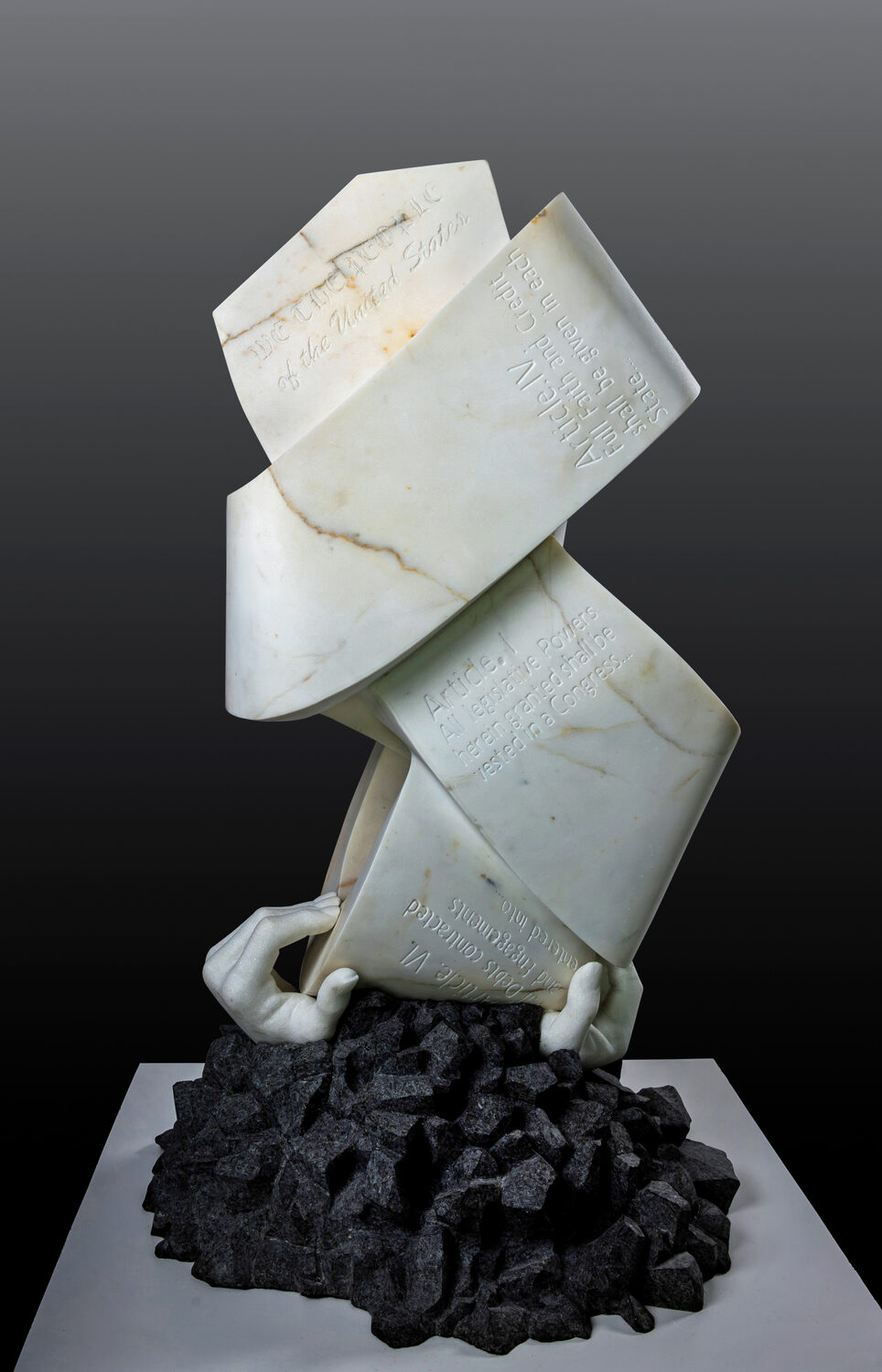 “U.S. Constitution in a Knot” distills the current political impasse into sculptural form. Robin Antar carves the full text of the Constitution, with all seven articles, into a tightly bound marble knot, transforming a foundational democratic document into an image of tension and entanglement. The work speaks to a nation caught in partisan gridlock, where core principles feel strained yet remain structurally intact. The knotted form is held aloft by a carving of the artist’s own hands, asserting individual accountability and the role of personal agency in sustaining civic ideals. Below, a bed of rough granite chips contrasts with the polished marble, evoking fragmentation, erosion, and the instability of public discourse. Through material precision and symbolic compression, Antar positions realism as a vehicle for critique, presenting the Constitution not as a static relic, but as a living framework under pressure, twisted and contested yet still upheld.