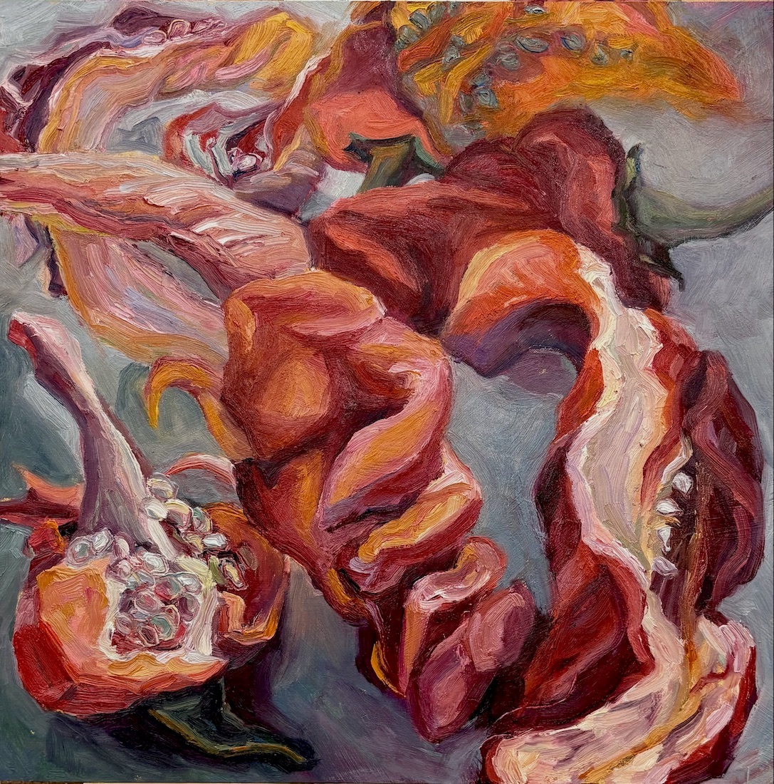 My subject matter often references the human form, gesture, memory, emotion, and sensuality. “Red Pepper Autopsy” has been fueled by the culinary action of cutting into red peppers. I am viscerally excited by the disembowelment of peppers, their flesh, and seeds. I celebrate the red energy and plump life of this vegetable and always savor its taste. I ingest this experience and then synthesize it into my own expression. My use of paint is visceral. I have an appetite for color and enjoy the manipulation of paint that grabs the eye and stirs the unconscious.