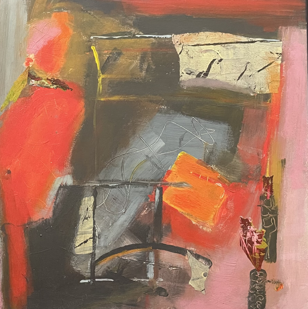 When I began this piece, I had just put down some color and marks on the canvas. When a shadow from the window behind me fell across the surface. I liked the way the shadow portrayed the windowpanes. I let that moment guide the piece, weaving in layered paper to echo both structure and light. I often see the moon or the morning light as it peeks in whenever I am working and used this as inspiration. The result seemed to tell of a view from within looking out and wondering if the view from outside was as stirring as the view from within.