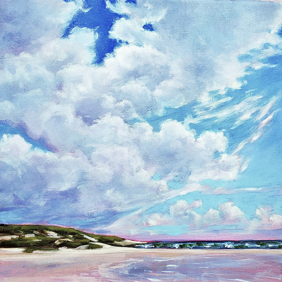 My acrylic painting, CLOUDY was my response to the sunlight and shoreline of South Carolina, with an overlay of memories from many summers spent on Cape Cod.