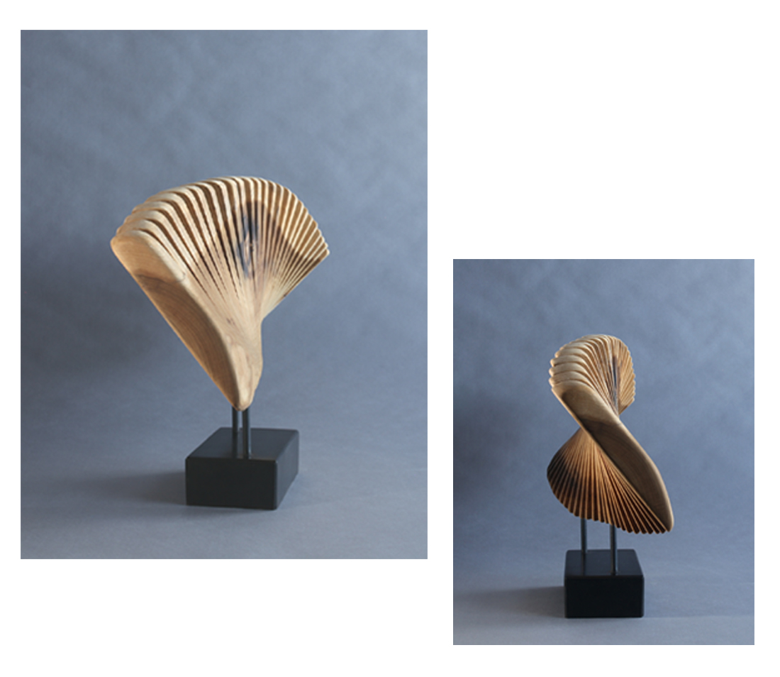In creating RIDING THE WAVE I brought together my love of poplar wood’s natural beauty and my fascination with the spiral form. First I carved and shaped the wood slab to highlight its particular grain patterns. Then, to form a wavelike shape, I sliced the slab into equal-width sections and attached them to one another with slightly offset positioning. Once assembled I further refined the form. To maximize its sense of movement, I elevated the sculpture and oriented it horizontally.
