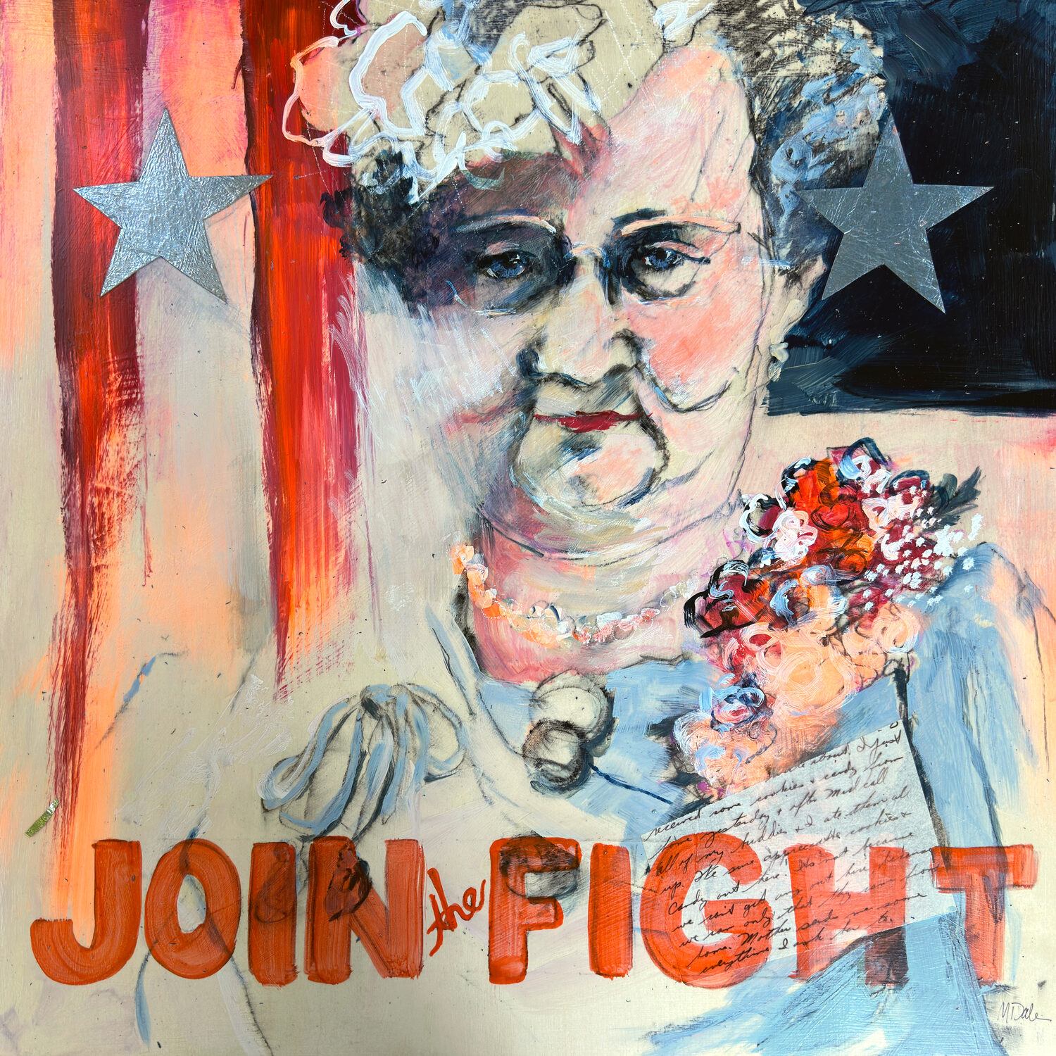Across the Between the Lines series, fragments of handwritten correspondence are embedded into the surfaces of the paintings. These letters function as both historical record and intimate voice, reminding us that national events are lived through personal relationships. Patriotic symbols appear not as decoration, but as lived realities—woven into ordinary lives shaped by sacrifice and responsibility.