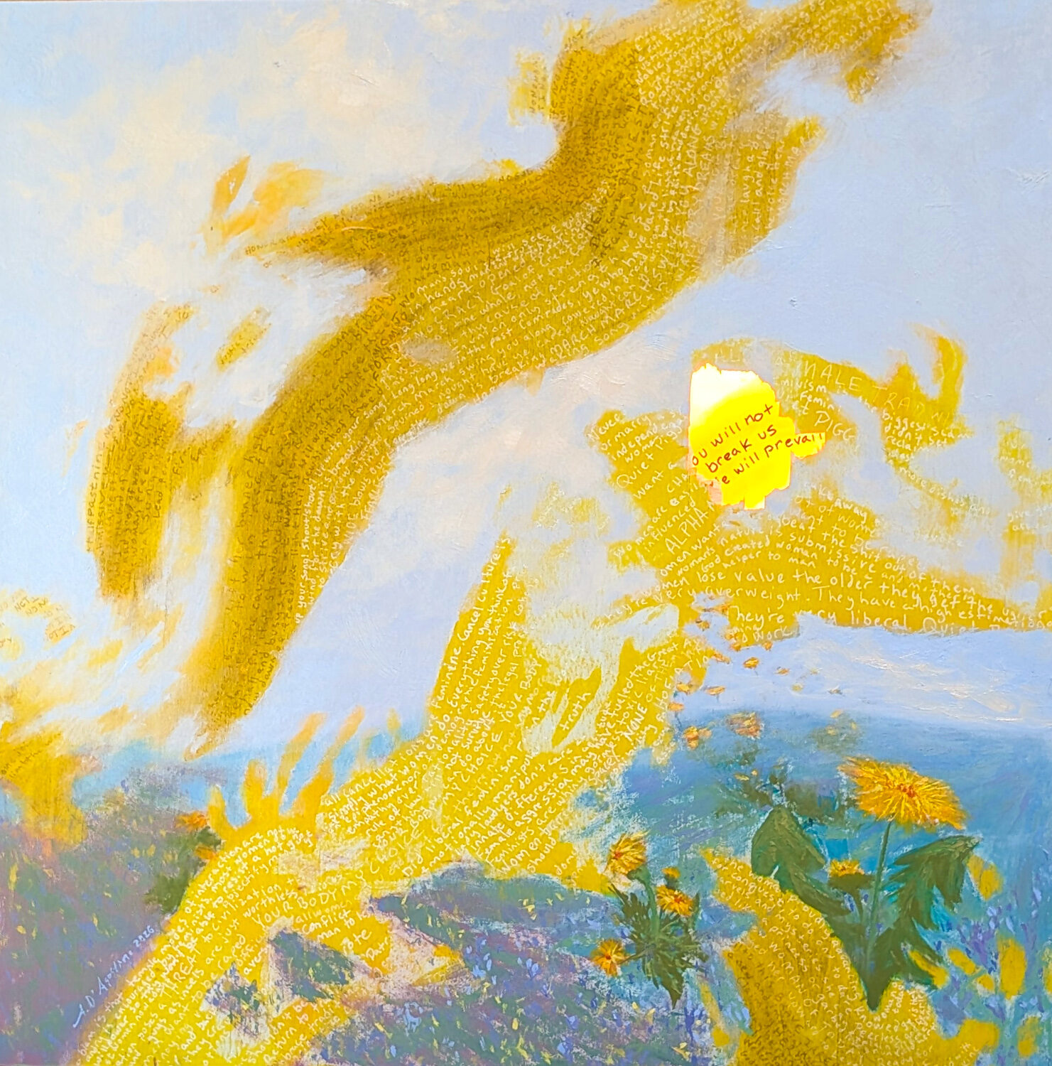 Using Women’s Suffrage sheet music in the National Archives and the colors of the movement (yellow, purple, white), this piece brings the past struggles and present challenges together with words and imagery. The sepia yellow sashes are filled with the chants and songs of the past, while the central bright yellow sash is inscribed with all of the worst thoughts and statements made about women today. The lighted focal box contains a simple message supported by the actions of the past: You Will Not Break Us, We Will Prevail. This lighted box includes a white extension cord and must be plugged in to light. Dandelions represent grit, perseverance, and finding ways to grow and survive even in the most unfavorable environments. Women of today can take hope and inspiration from our foremothers, despite all of the vile anti-feminist ideas bombarding us today. We will prevail.