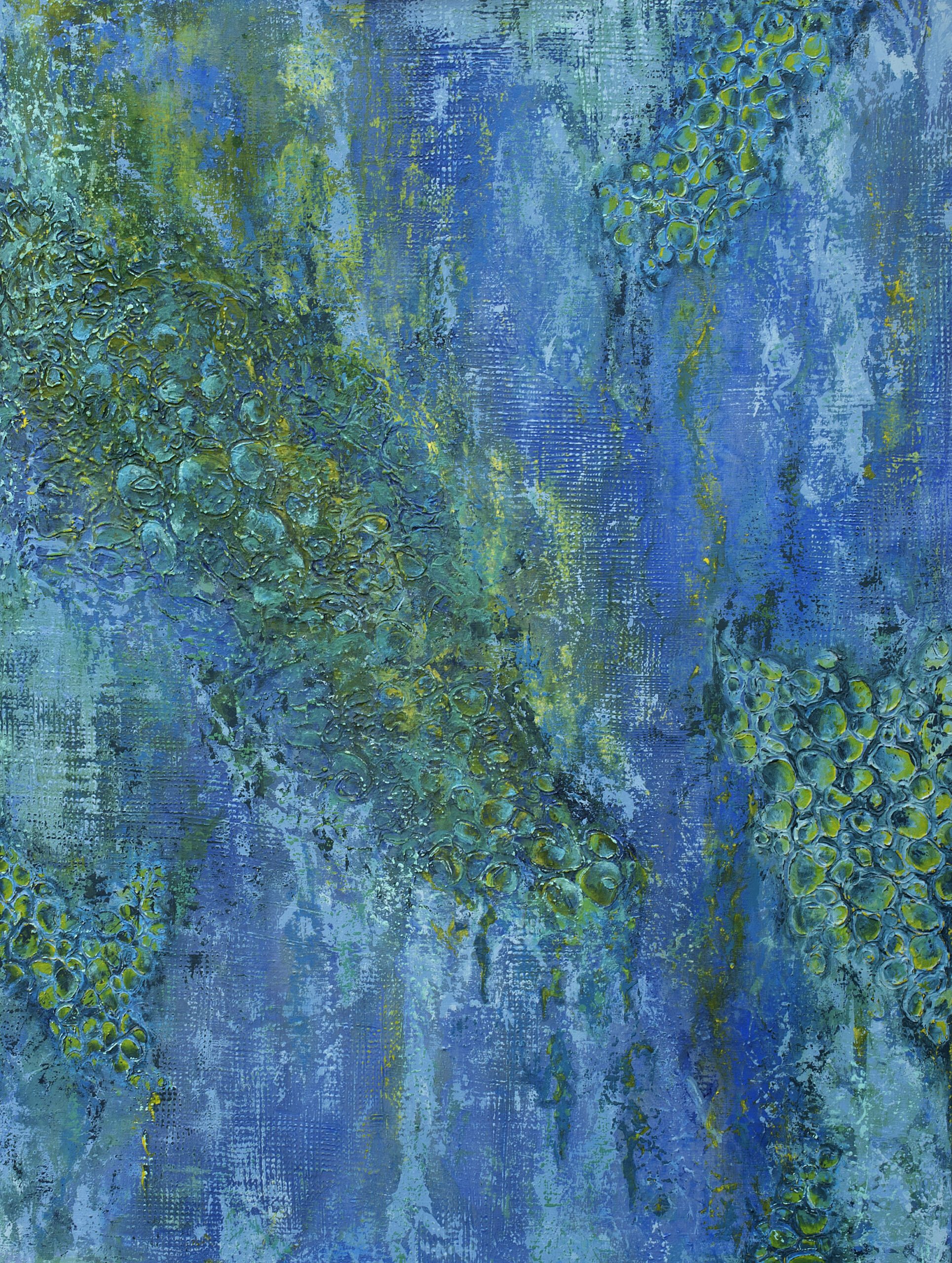 On a flight out of Ft Lauderdale, I was stunned by the beauty of the Bahamas’ West End. Using varying viscosities of acrylic paint, multiple layers were added, scraped through, and manipulated, creating a tactile surface. Transparent layers intertwine with thick impasto structures reminiscent of the carbonite rocks and coral reefs visible in the crystal clear waters of the Atlantic.