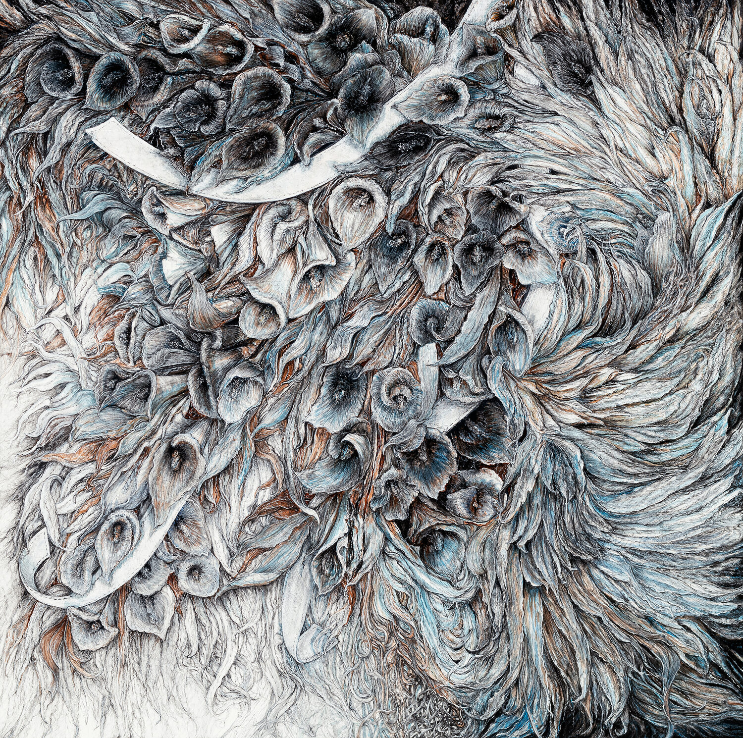In Memoriam by Linda McCune is a somber even ghostly image of lilies of remembrance for an unnamed, contributing multitude of women who are not famous in the sense that we know their names or faces, laude their achievements, and record much of their lives. In the 250 years that we are celebrating this year, an estimated 235 million women have been born in this country, based on this number of years 250 have been selected by USA Today and categorized by founders, suffragist and reformers, trailblazers and leaders, and of modern era importance. Indeed, these should be highly regarded an acknowledged. However, my mind wandered to the scant history of my mother, grandmothers, great grandmothers multiplied by thousands of women, each with an importance unrecognized in this celebrated public way. As the movement in my drawing suggests, they amazingly pushed women’s collective history forward daily as an unseen force amidst much gender bias and I wanted to acknowledge their lives as if I had taken this bouquet to each funeral.
