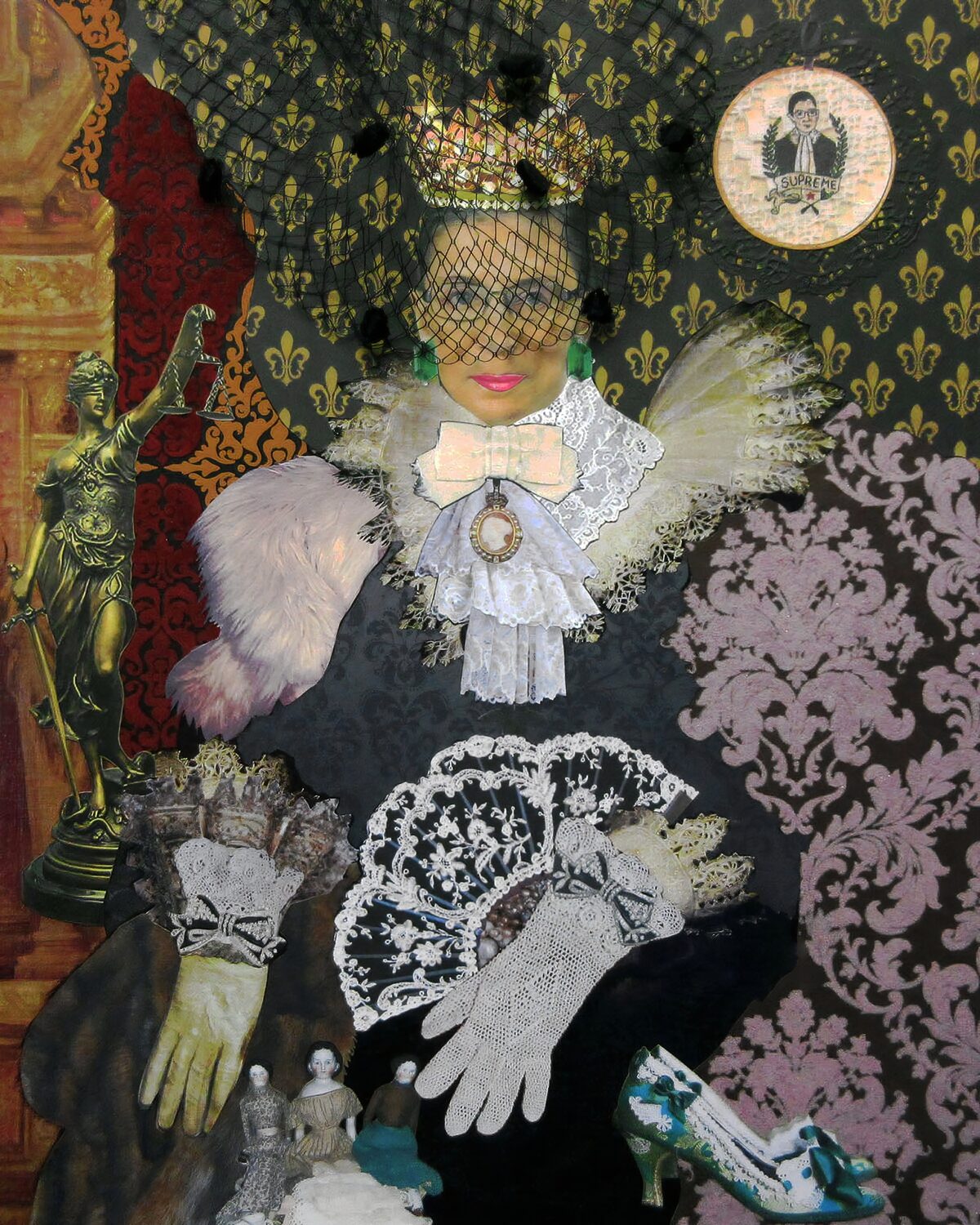 My inspiration was Queen Anne of Austria (former Queen of France). With my feminist spin, I’ve transformed her persona into Supreme Court Justice Ruth Bader Ginsburg. During a talkback session following a 2018 performance of “The Originalist”, an Off-Broadway play at 59E59 Theaters in New York, she referred to herself as a “flaming feminist”. The play centered around her close friend and ideological opposite, the late Justice Antonin Scalia. During the theatrical outing, at 85 years old, she also joked about her then, newfound, mainstream fame (Notorious RBG) and expressed her intention to remain on the bench for at least another five more years. This declaration was part of her long history of speaking boldly and openly about her advocacy for gender equality and women’s rights, during her entire career as a lawyer and as a Supreme Court Justice. She was inducted in The National Women’s Hall of Fame in 2002.