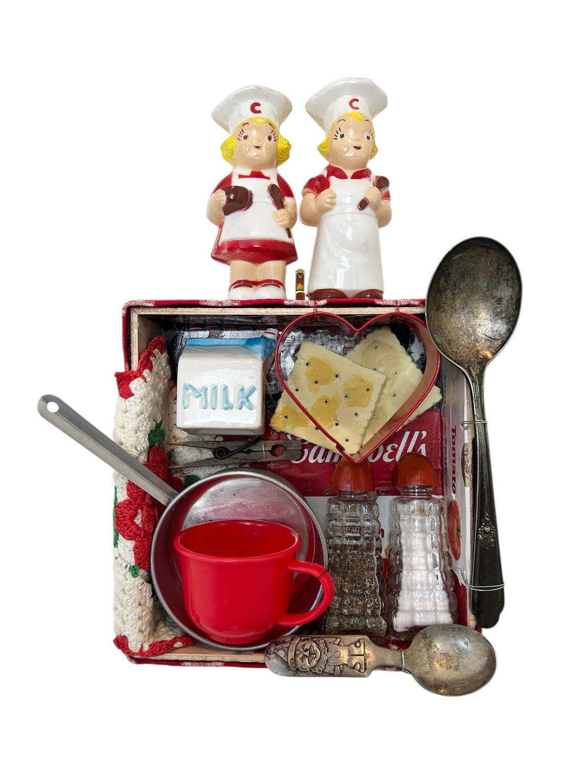 The painting shows four women standing together, their heads gently inclined toward one another, creating a sense of intimacy. The surface feels textile-like, almost embroidered, with repeated marks that feel like folk traditions. Despite the complexity, the patterns flow together into a cohesive whole rather than competing for attention.