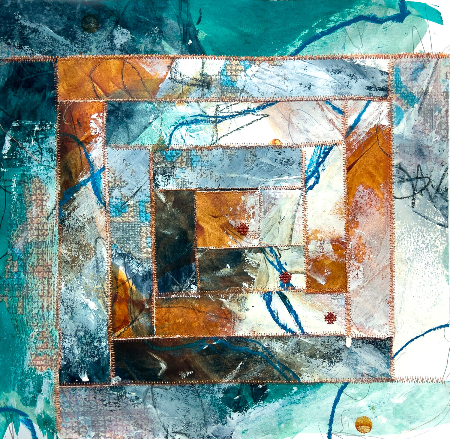 acrylic, ink, graphite, image transfer, and thread on paper