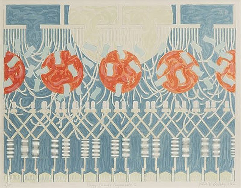 JKB: That’s an excellent question. I like two things. I’m an etcher and a lithographer. And I like both of them because they are drawing. I’m not too fond of silkscreen. I did a couple of lovely woodcuts when I was taking printmaking, but I’ve never done woodcuts since then. But it entirely depends on what my project is at the time. For instance, there are projects where immediately I’d say, These have to be etchings. And then there are other projects which have to be lithos. When I’m involved with something that requires swaths of color, I’m more apt to decide to do lithographs. Because then I can get a beautiful swath of color, another one, and another one. But in both instances, I’ve reached a point where I like to work with registering plates. Initially, I did a lot of work with viscosity printing, which was invented by Stanley William Hader at Atelier 17 in Paris and was very popular in the 1960s and 1970s.