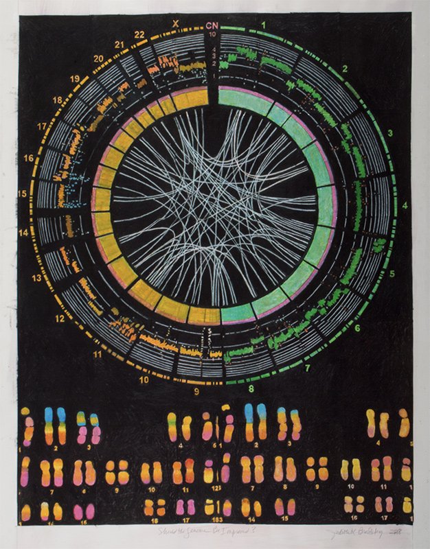 Can the Genome Be Improved? 2018, Oil stick over digital collage,65 x 42 inches, courtesy of Judith K. Brodsky.