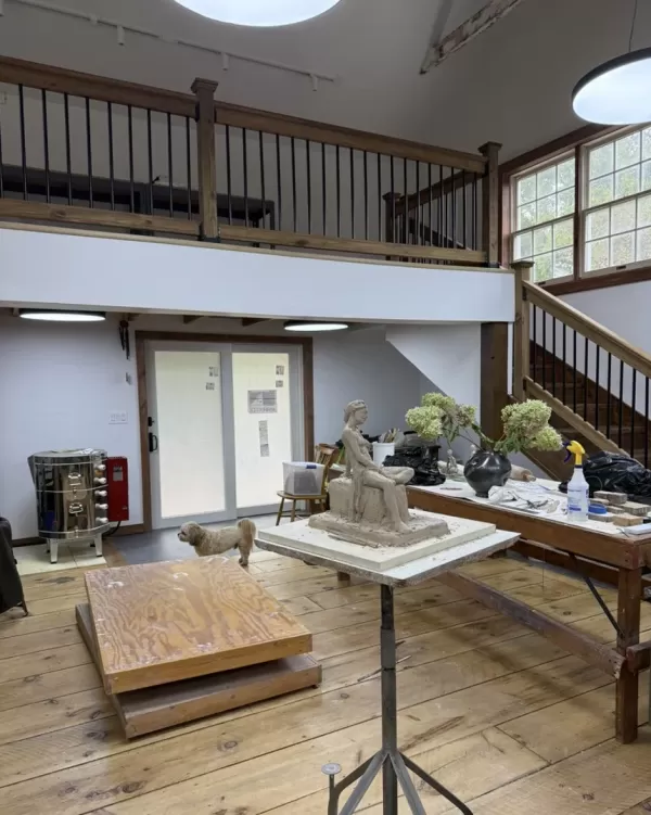 Interior with stand for the model, stand for my sculpture and in the back is the kiln where I fire the work. Upstairs there is a loft for finished work.