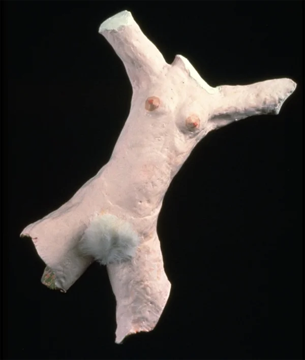 Torso formed on a pole. Sometimes I incorporate other materials into the sculpture. This one has feathers and is finished with encaustic.