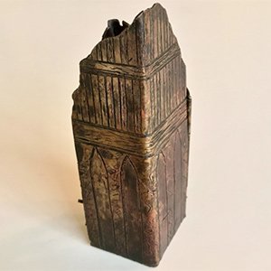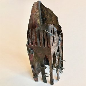 The second piece in the series is named “9/11/01 – The Day After” (Figures 7-9). The image reflects one of the pictures shown in a newspaper of one partial wall standing with some arches still intact. The piece is formed of distressed copper, is free-standing and can be opened. It measures 5”x 1.5” x 1.5” closed, and 4” x 5” x 1.5” when open. Pieces were hand-sawed and soldered together. The lines on the back were acid etched. When the acid solution is applied to the copper, it eats into the medal.